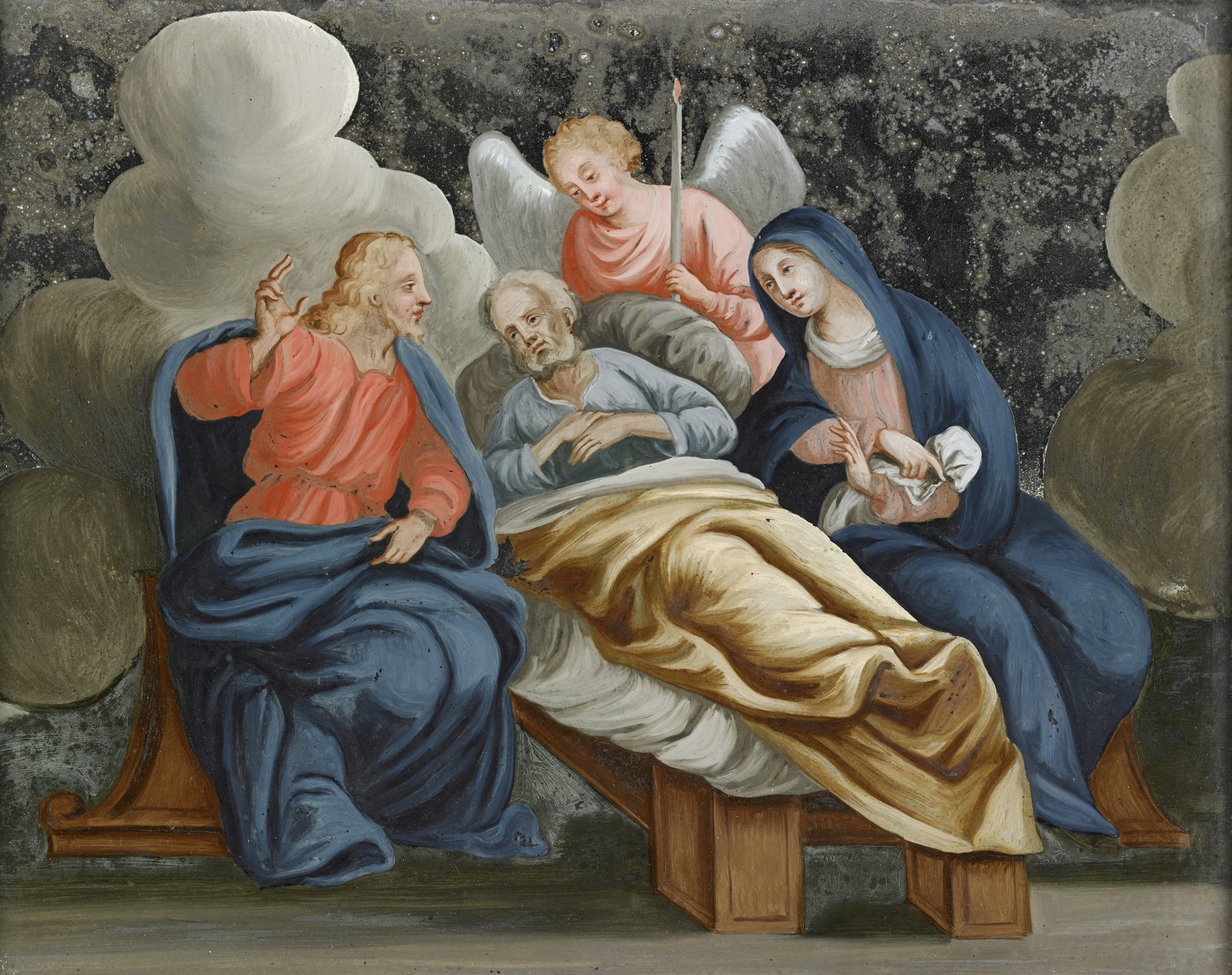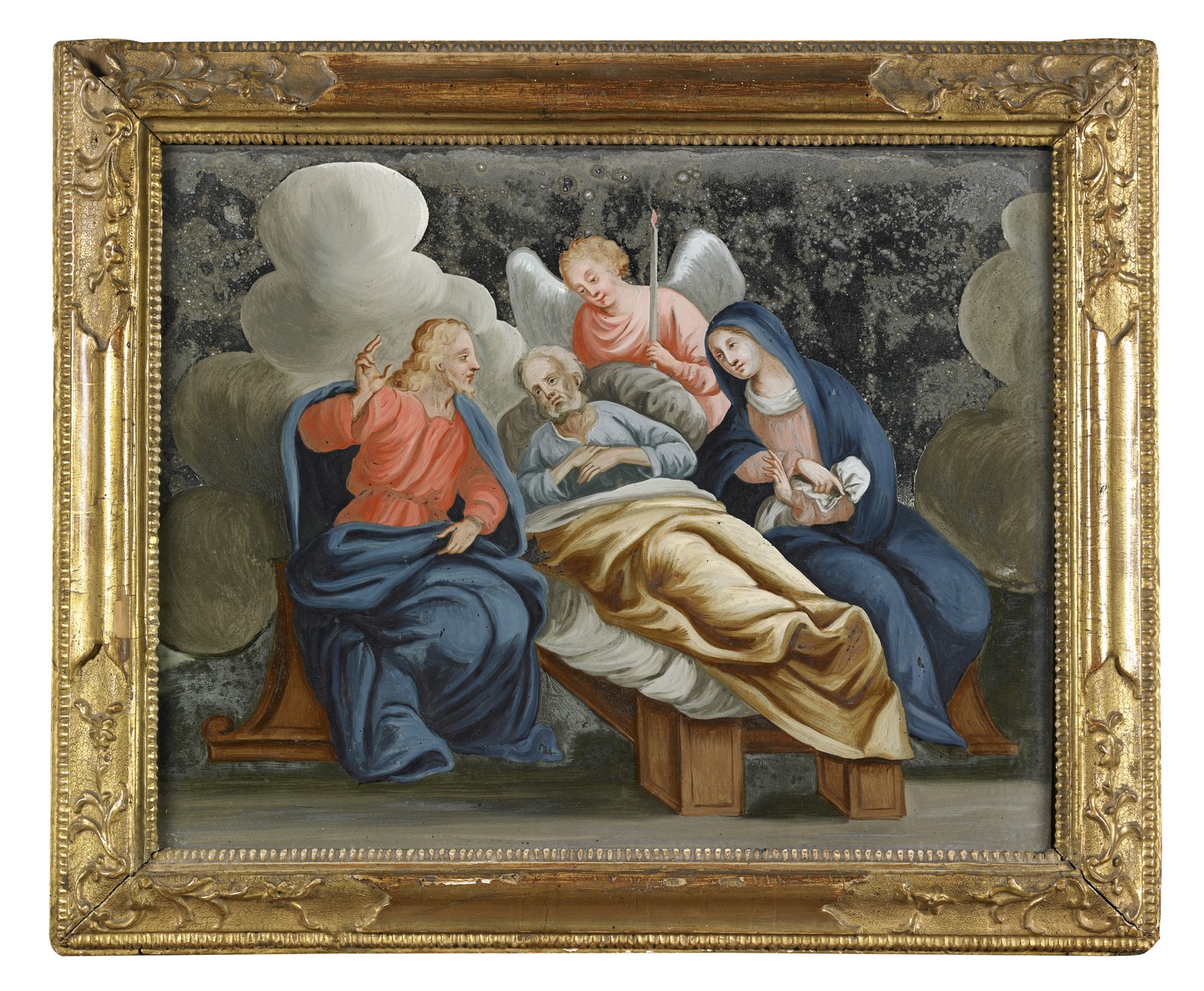 PITTORE VENETO DEL XVIII SECOLO Transito di San Giuseppe. . Olio su vetro. Cm...
