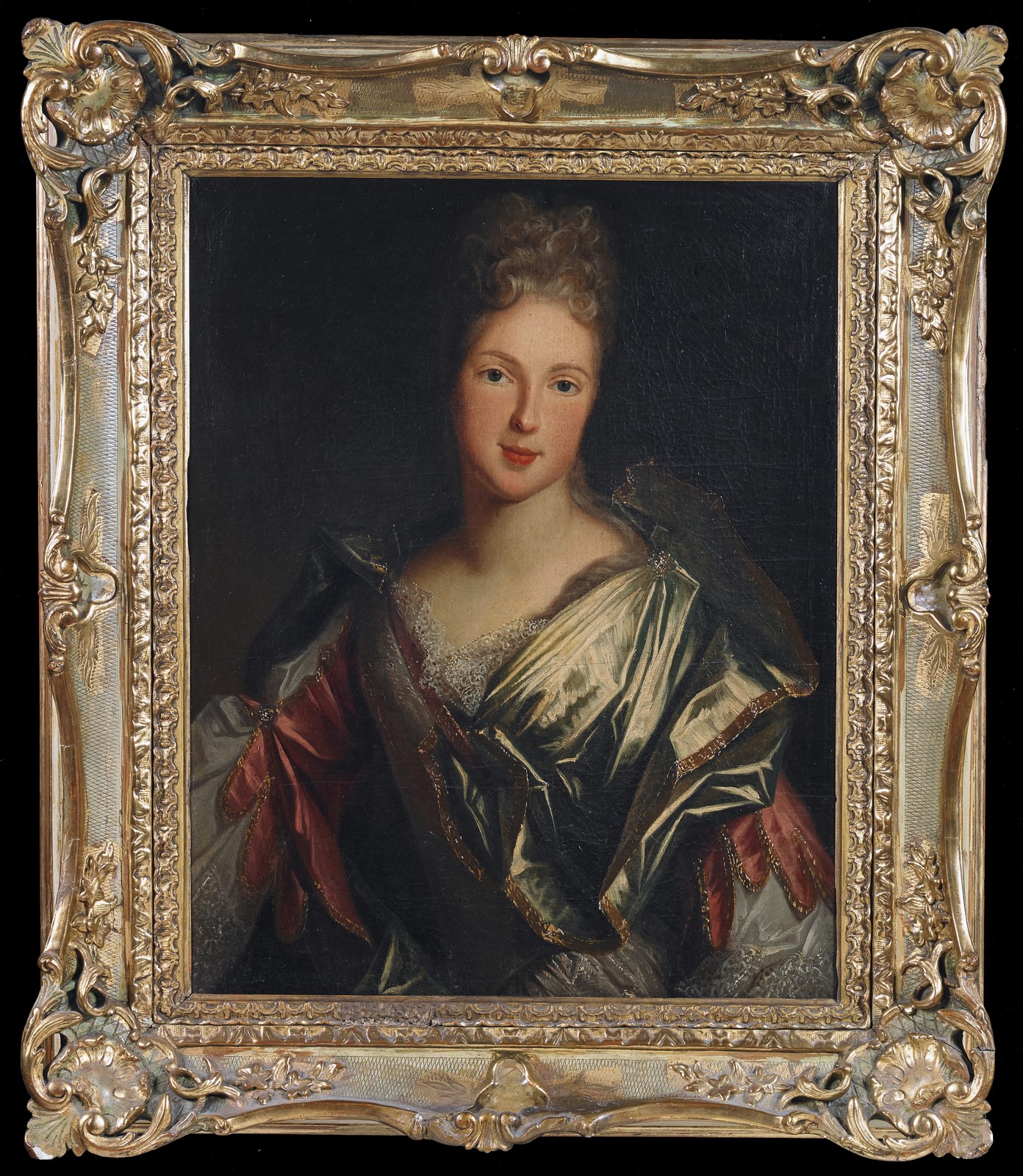 ARTISTA FRANCESE DEL XVIII SECOLO Ritratto di gentildonna. Olio su tela . Cm 57,00 x 73,00. Al retro riporta la scritta "M. Nattier". . Cornice presente
