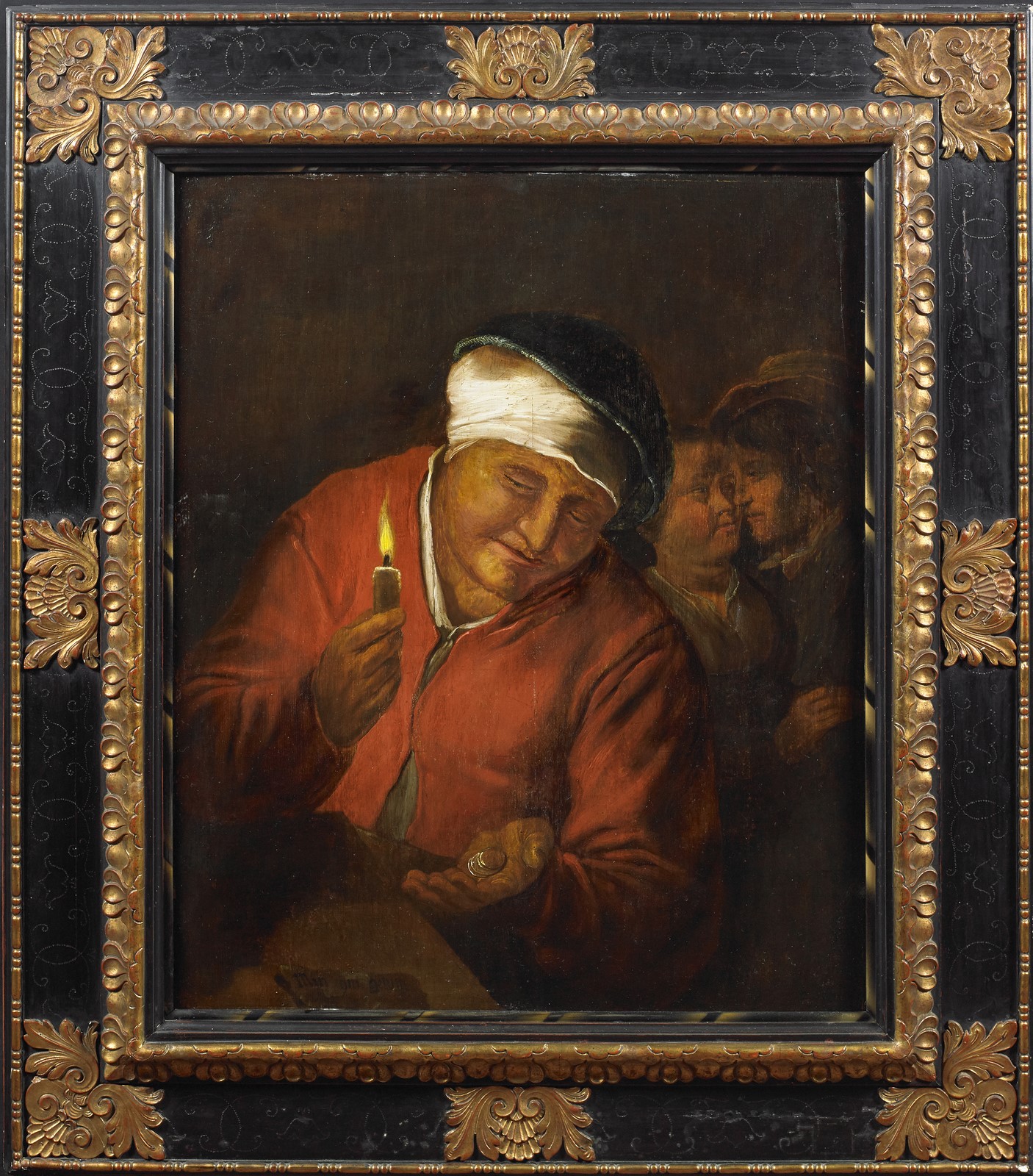 ARTISTA NORDEUROPEO DEL XVII SECOLO Figura a lume di candela. Olio su tavola. Cm 63,00 x 75,00.