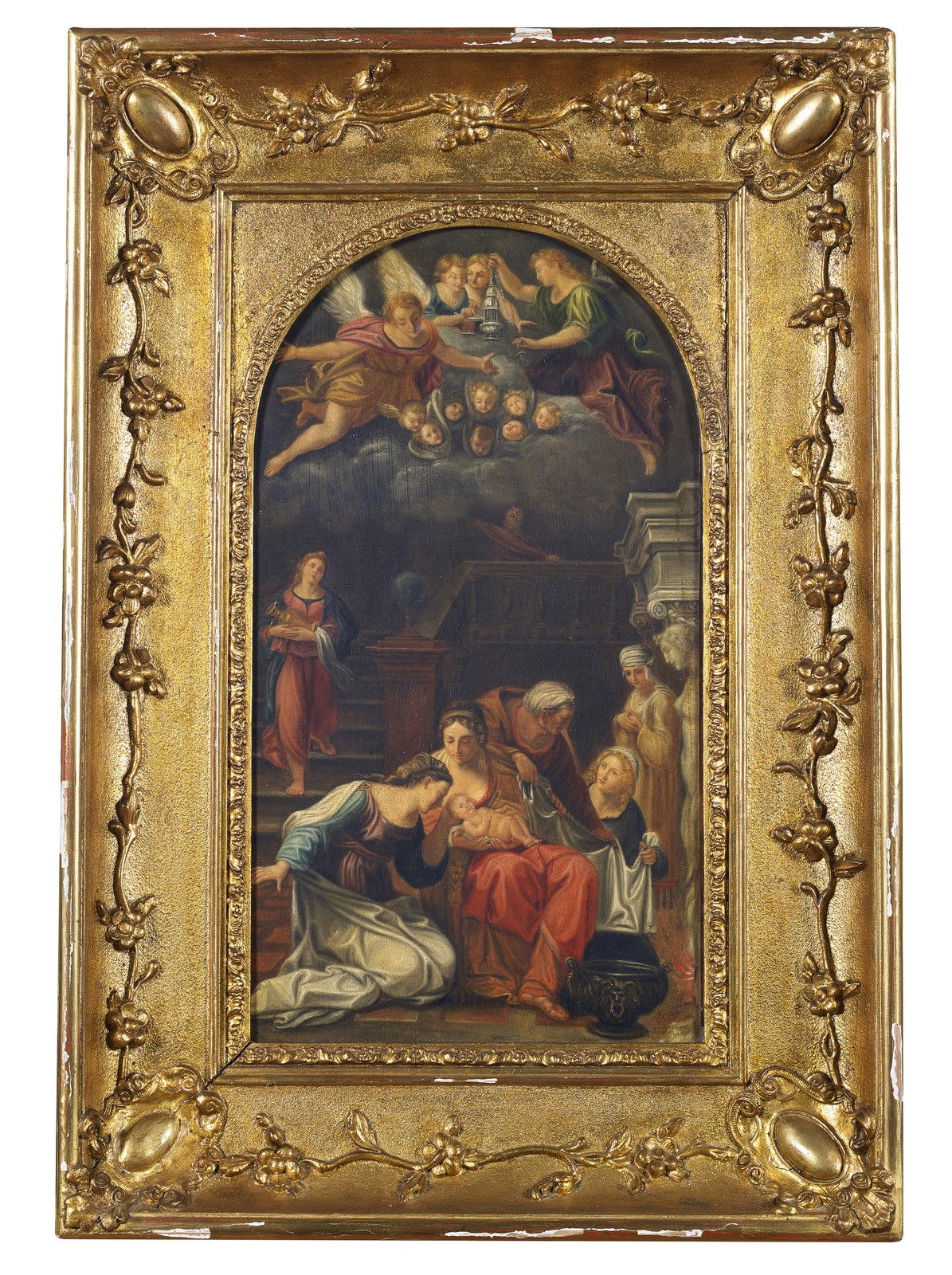17th CENTURY ARTIST Madonna with a Child. Oil on canvas . Cm 27,50 x 49,00. . Cornice presente
