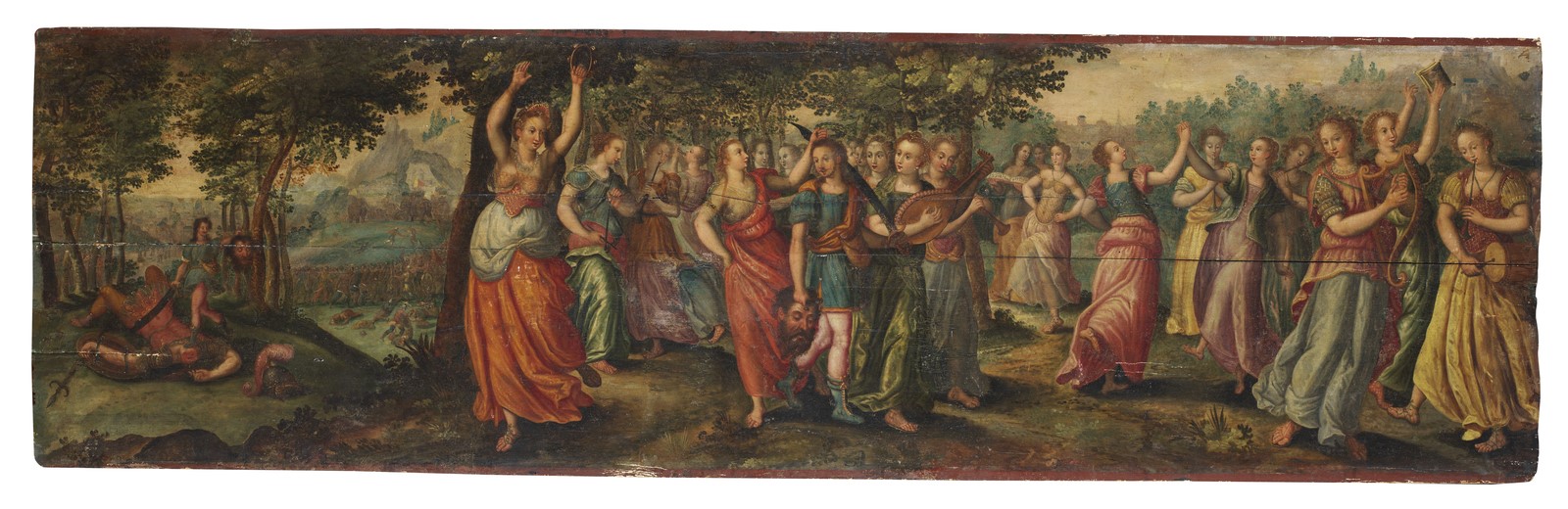 SCUOLA DI FONTAINBLEAU (XVI-XVII SECOLO) Davide vincitore. Olio su tavola. Cm 164,50 x 49,00. La tavola presenta difetti.