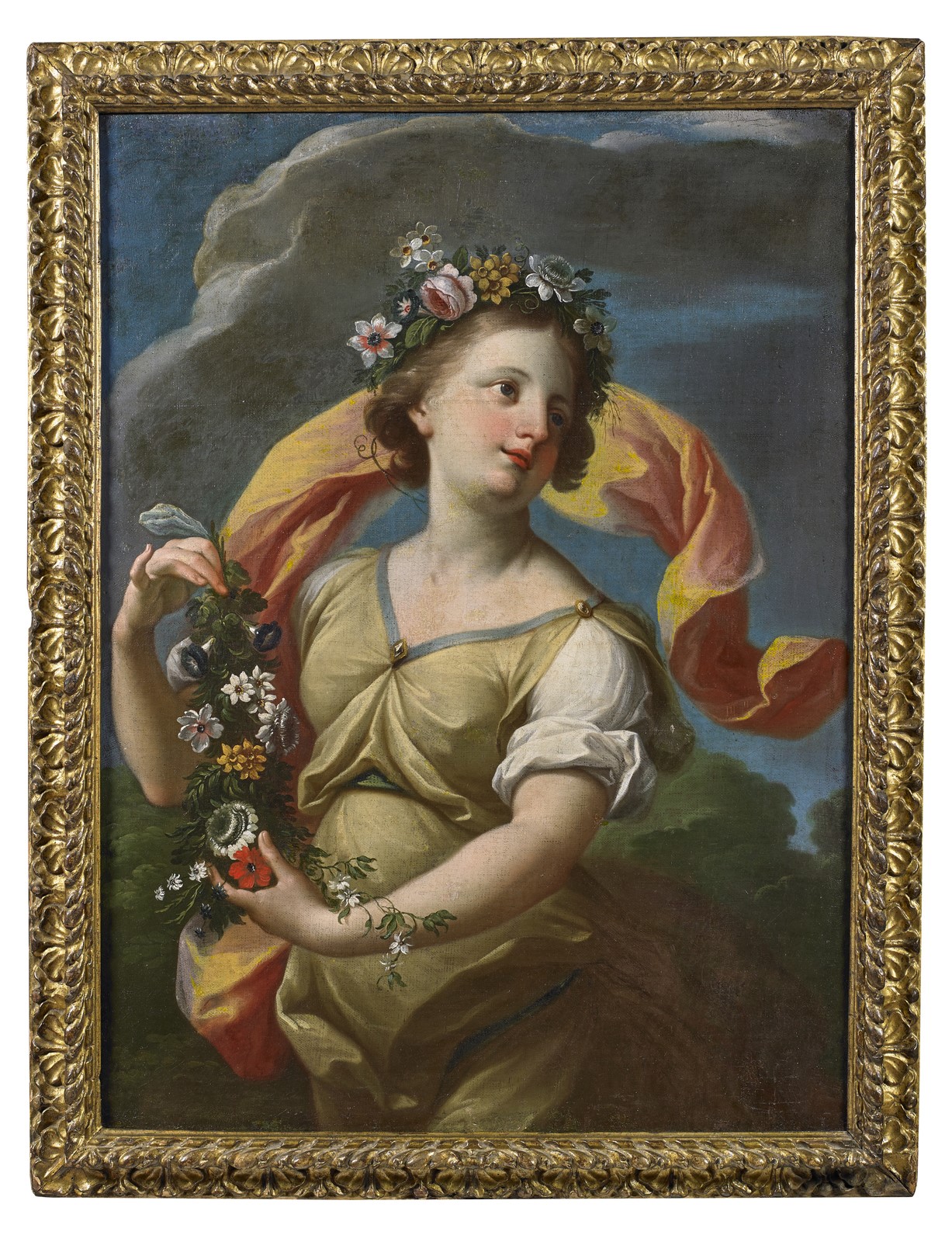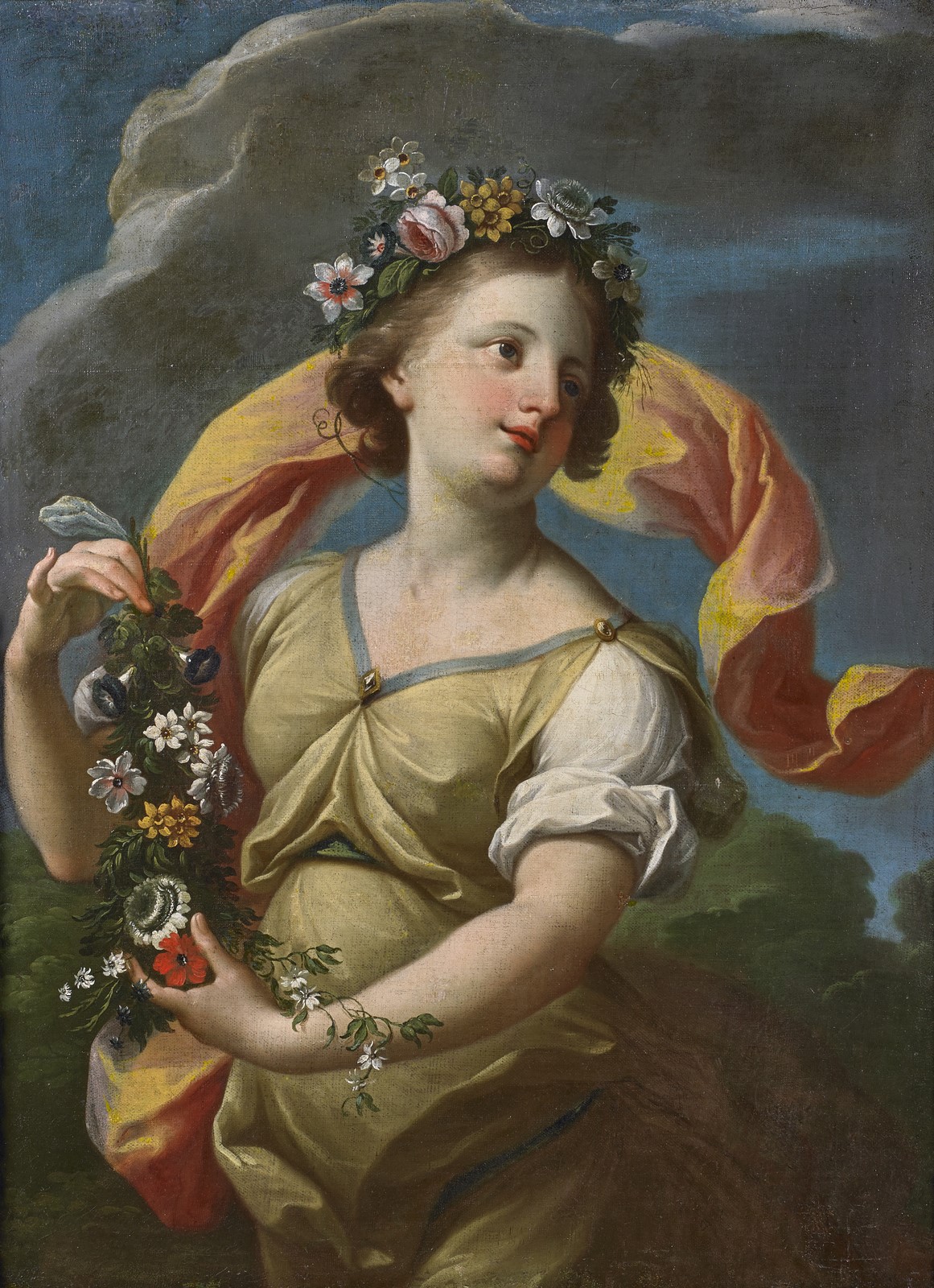 PITTORE EMILIANO DEL XVIII SECOLO Flora. . Oil on canvas . Cm 73,00 x 98,00. Frame of epoch. . Cornice presente