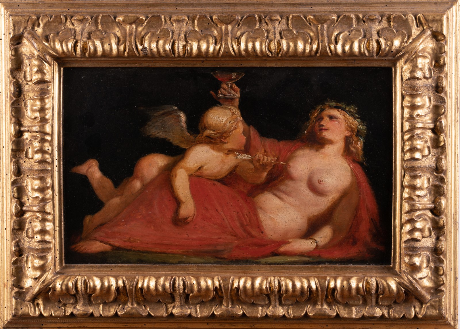 COMERIO FILIPPO (1747 - 1827) Baccante with Cupid. Oil on board. Cm 37,00 x 22,00. The painting is accpompanied by a card by Emilio Negro, September 26th 1999.