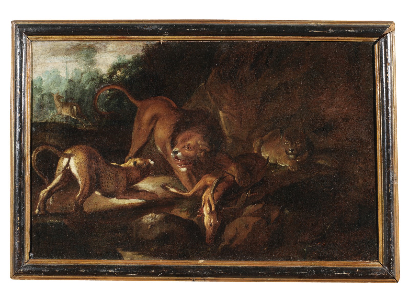 SCORZA SINIBALDO (1589 - 1631) Attribuito a. Scena di caccia con leone, tigre e puma. Olio su tela . Cm 74,00 x 48,00. . Cornice presente