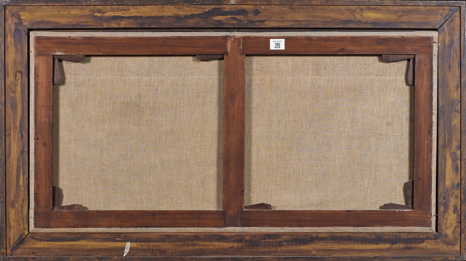 BOTH JAN (1615 - 1652) Attributed to. Landscape with river and horsemen. . Oil on canvas . Cm 150,00 x 74,00. . Cornice presente