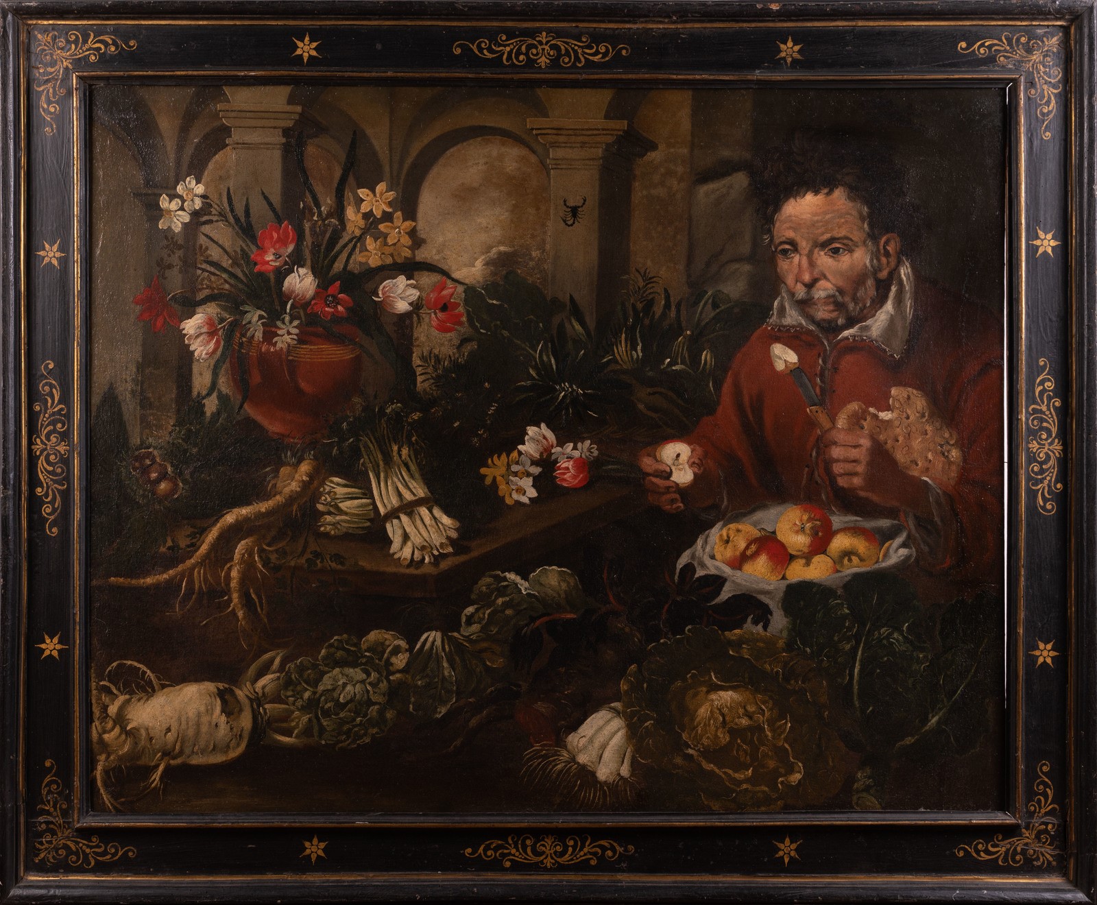 17th CENTURY ARTIST Fruits and vegetables seller. Oil on canvas . Cm 133,00 x 104,00. . Cornice presente