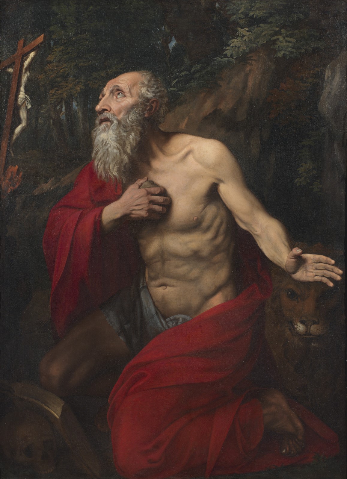 ARTISTA LOMBARDO ATTIVO FRA XVI E XVII SECOLO San Girolamo penitente. Olio su tela . Cm 97,00 x 132,00. In antica cornice intagliata e dorata. Cornice presente