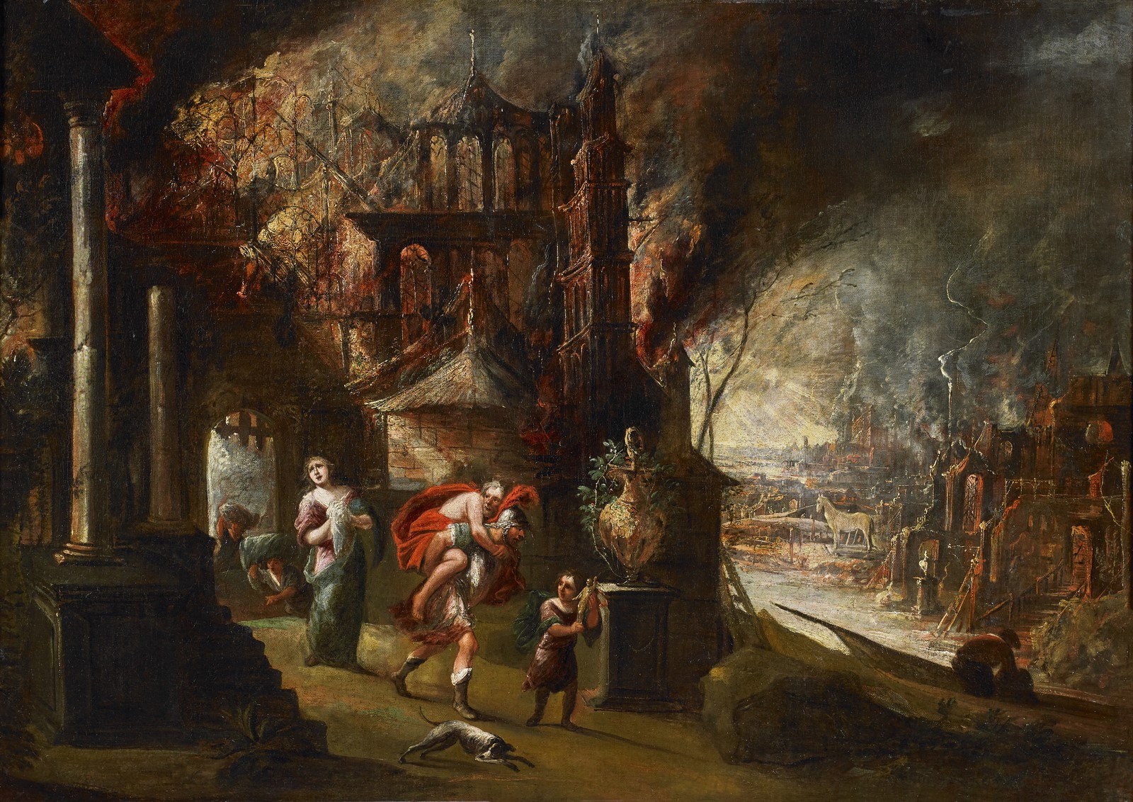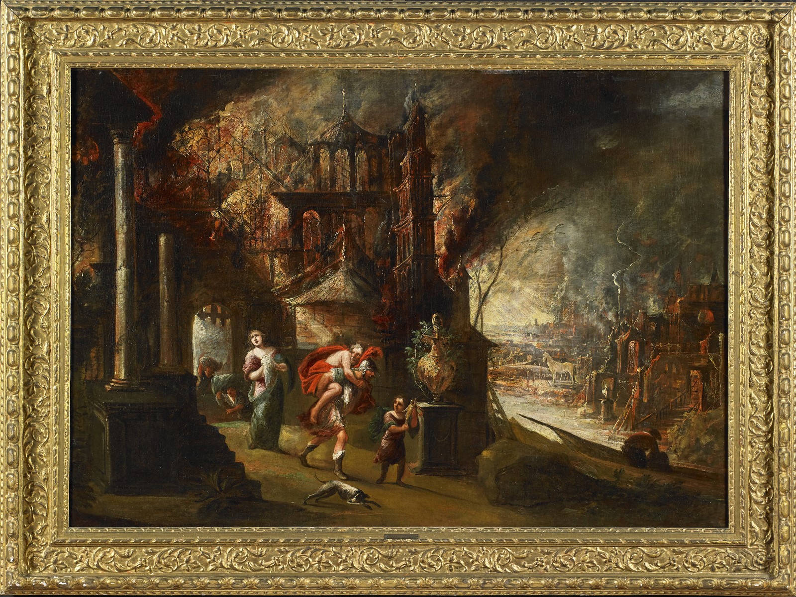 VAN HEIL DANIEL (1604 - 1662) Attributed to. Flight from Troy. . Oil on canvas . Cm 119,00 x 83,50. We are grateful to Maria Rosaria Nappi for suggesting the attribution of the present painting. For the complete card please consulting www.capitoliumart.it Cornice presente