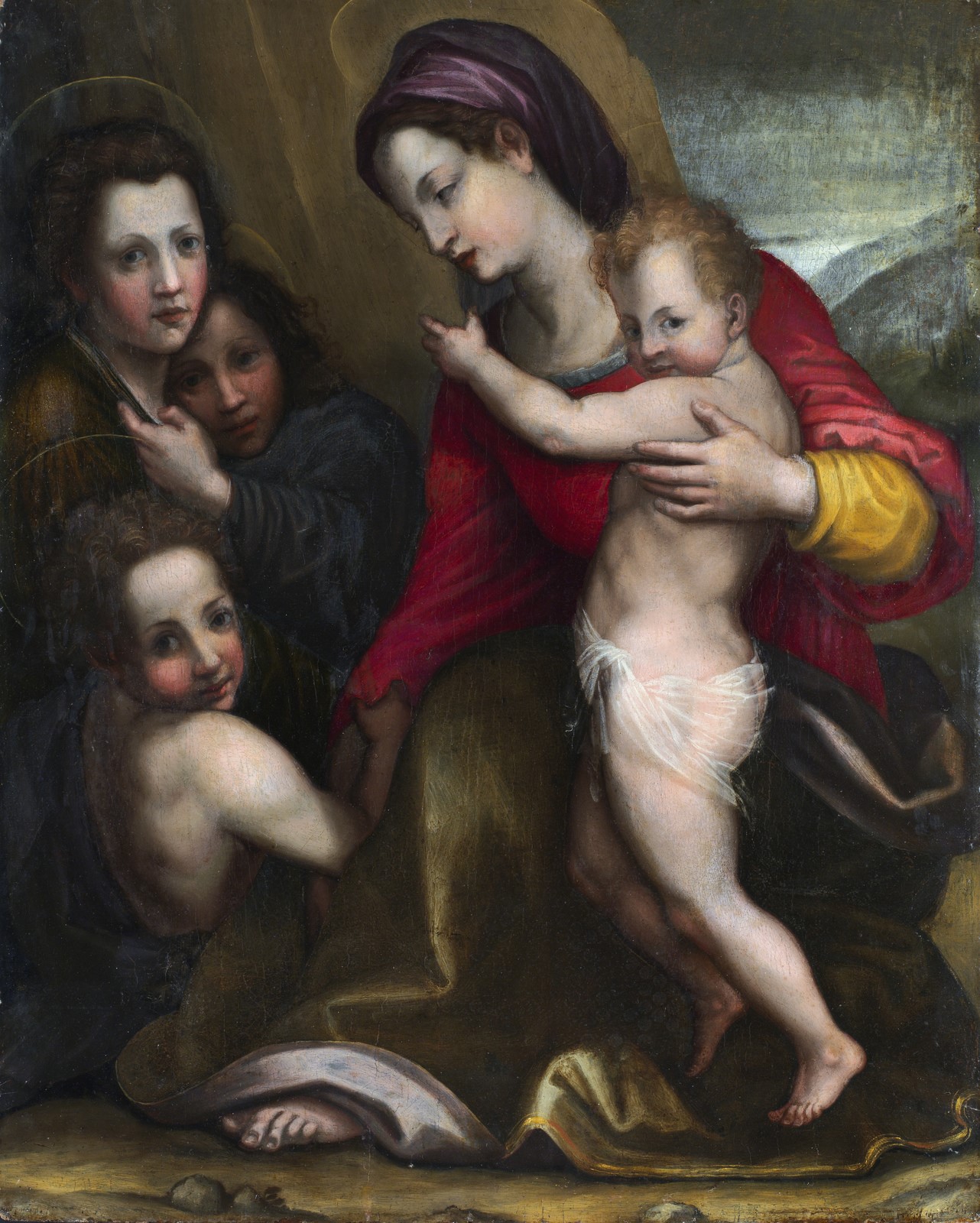 DEL SARTO ANDREA (1486 - 1530) Follower of. Madonna with child and Saints. . Oil on board. Cm 70,00 x 88,00.