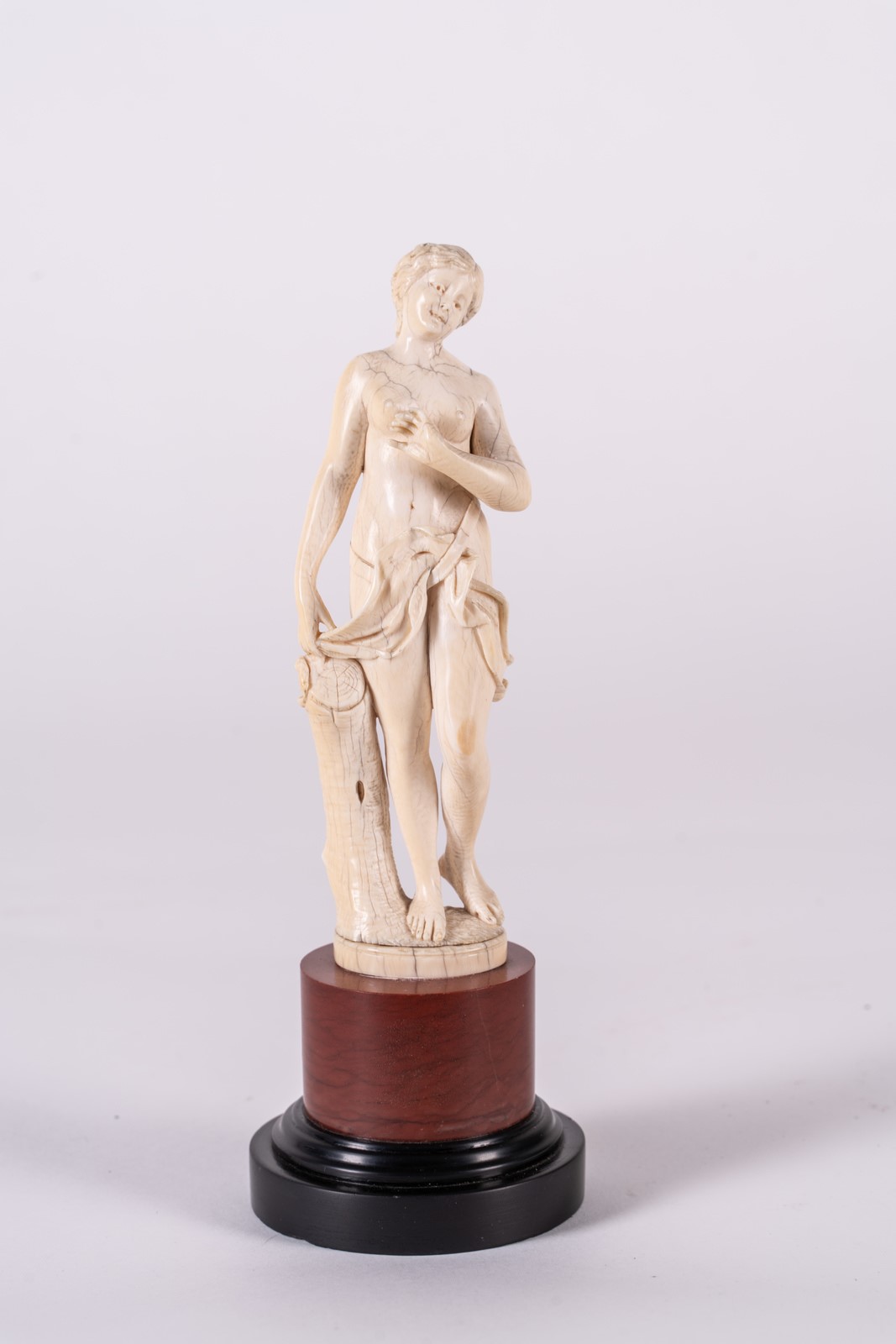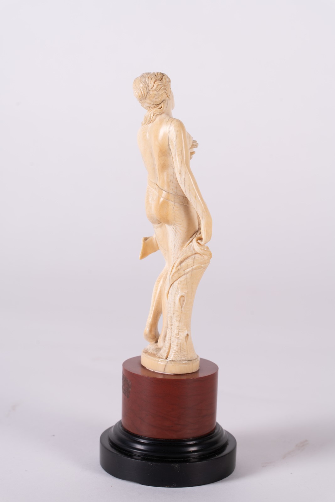 ARTISTA DEL XIX SECOLO Figura di donna. . Avorio. Cm 7,00 x 22,00. Base in legno. Misura scultura: 16,5x4 cm.