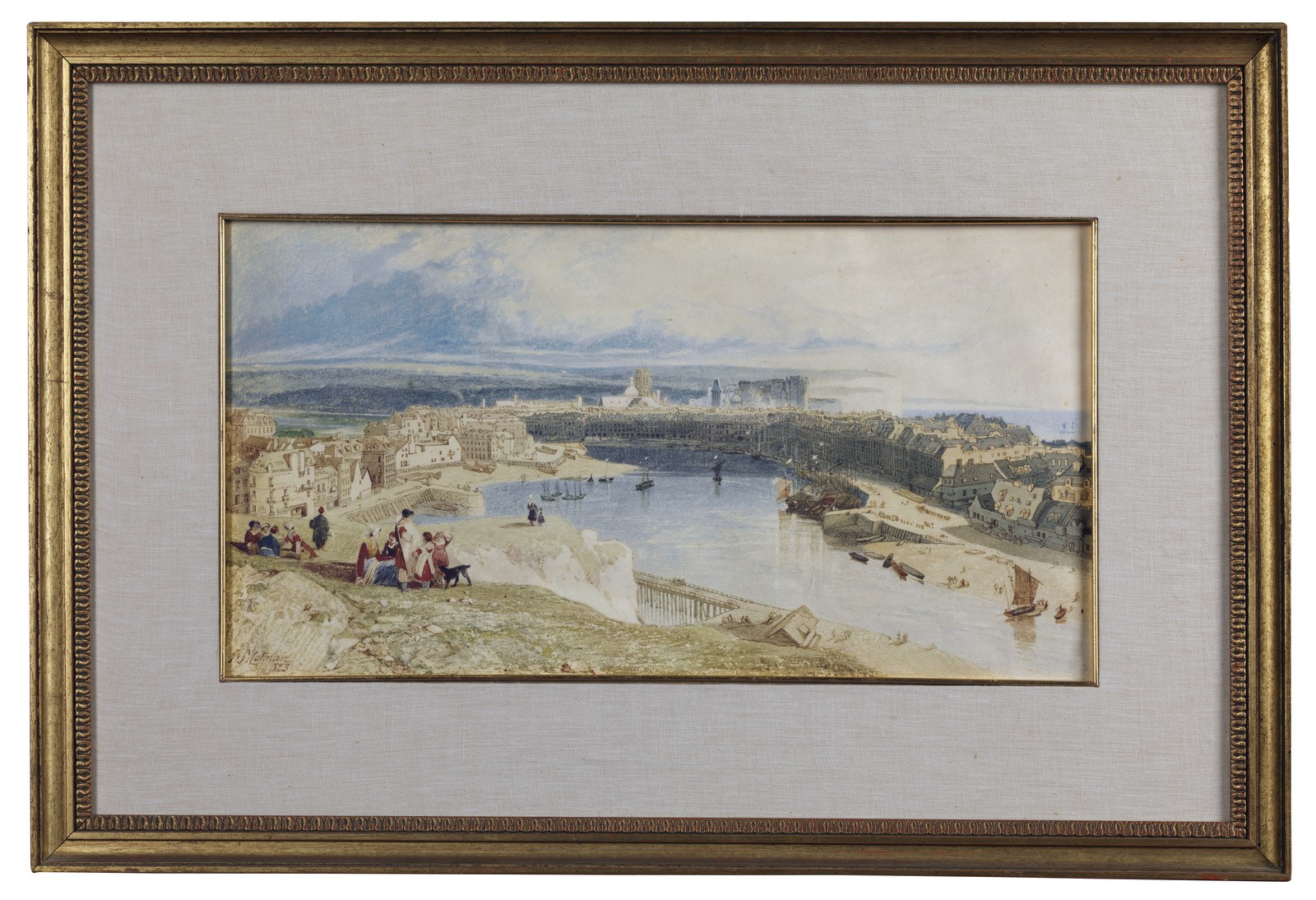 COTMAN JOHN SELL (1782 - 1842) Veduta di porto con personaggi. . Acquerello su carta. Cm 52,50 x 27,50. Firmato e datato 1823 in basso a sinistra. . Cornice presente