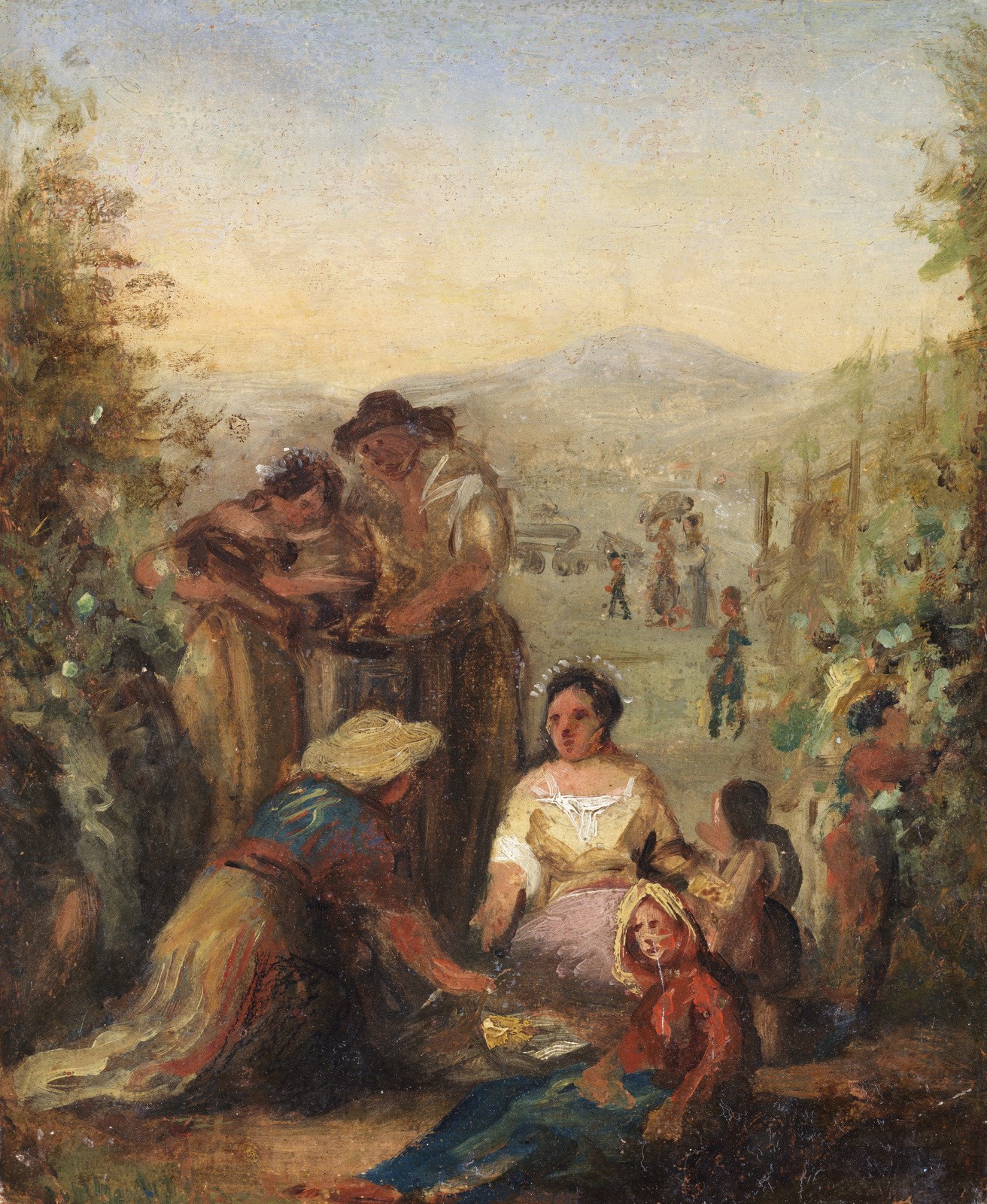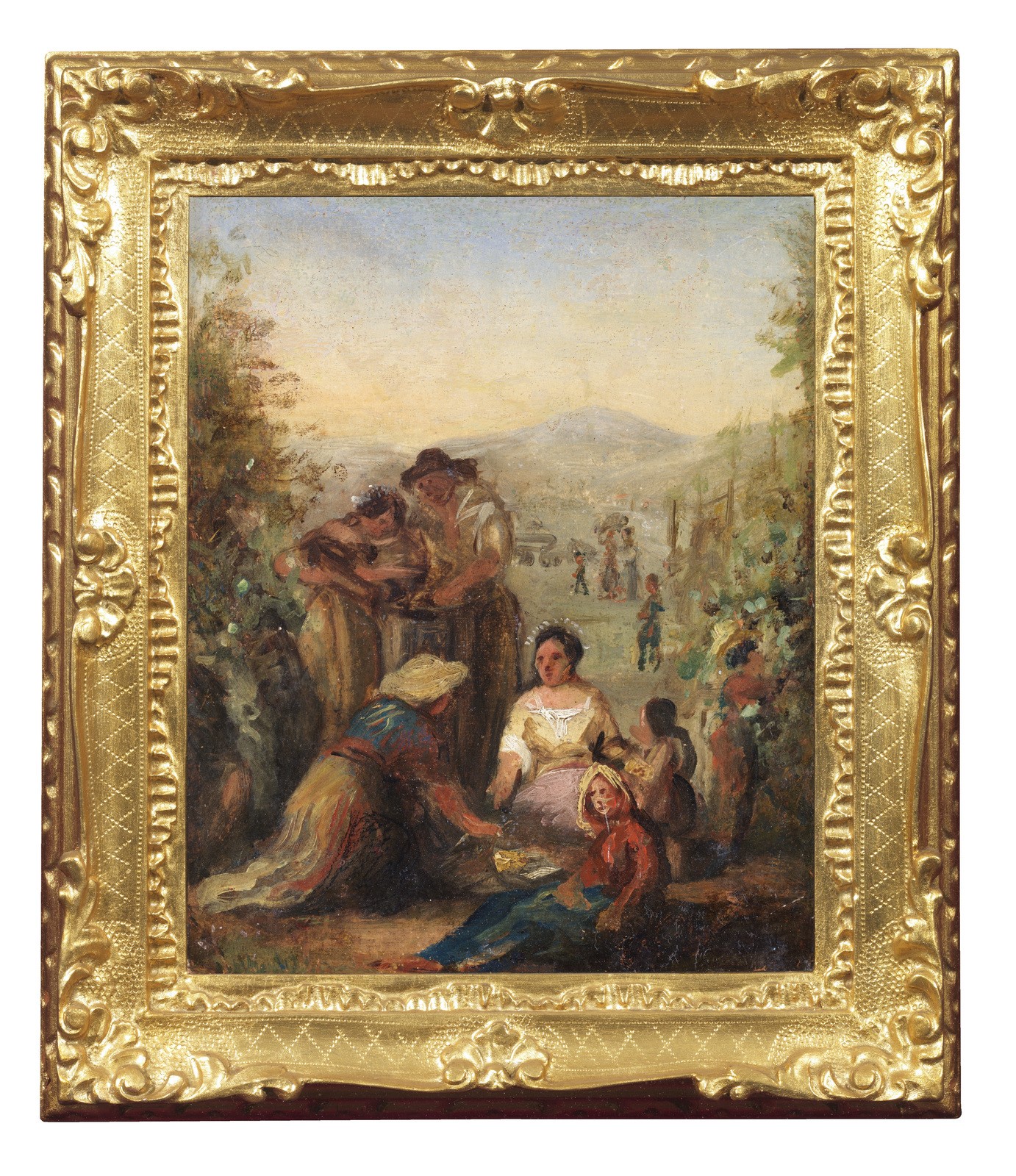 INGANNI ANGELO (1807 - 1880) Characters in a landscape. . Oil on canvas . Cm 19,50 x 23,00. . Cornice presente