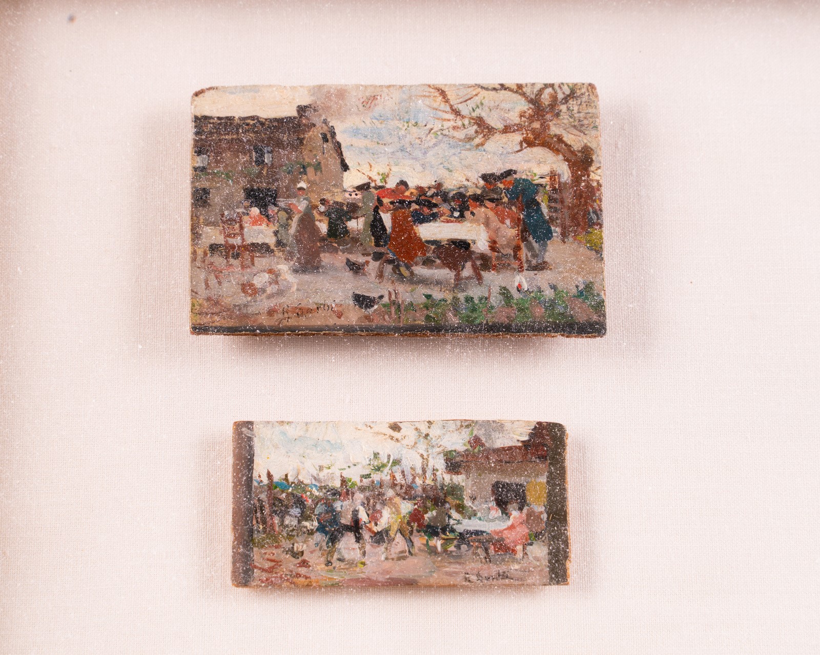 SORBI RAFFAELLO (1844 - 1931) Four painting depicting landscapes and inns. . Oil on panel. Cm 7,00 x 5,00. Signature lower. Sizes: 4x3,5cm; 5,5x3 cm; 6,5x3 cm. . Cornice presente