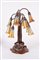 TIFFANY STUDIOS Lily lamp, stem model 381 in bronze with brown patina, decorated with leaves and water lily buds, with ten branches ending in the glass to accommodate the ten tulipes in Favrile iridescent glass forming water lily leaves. . Cm 50,00. Epoch 1902-1920. Signature at the base Tiffany Studios New York, n. 381. Le Tulipes siglate L.C.T.