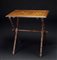 GALLE' EMILE (1846 - 1904) Tavolino in marqueterie con legni di varia essenza, decori floreali, foglie e di volatile, gambe struttura x a motivi bambou. . . Cm 72,00 x 73,00 x 52,20. Firma ad intarsio "Gallè", epoca 1890 circa. Parere verbale di Borga Franco.