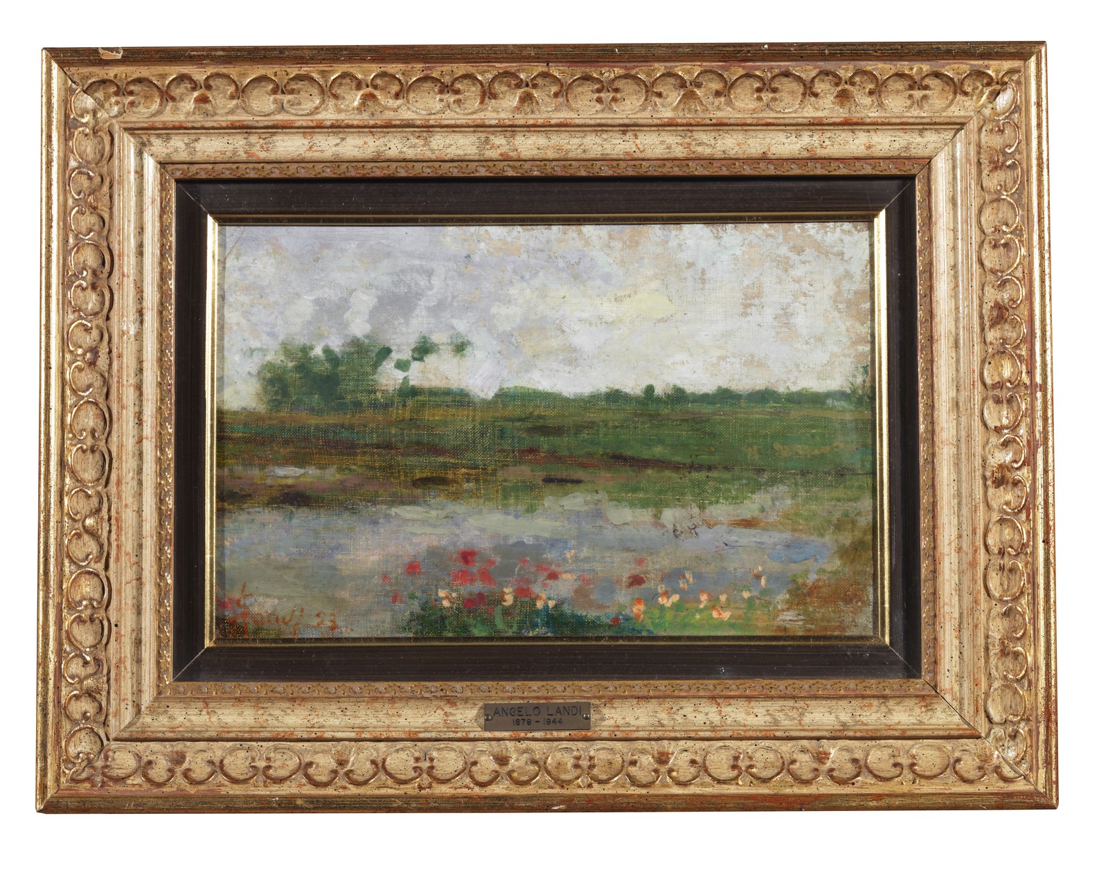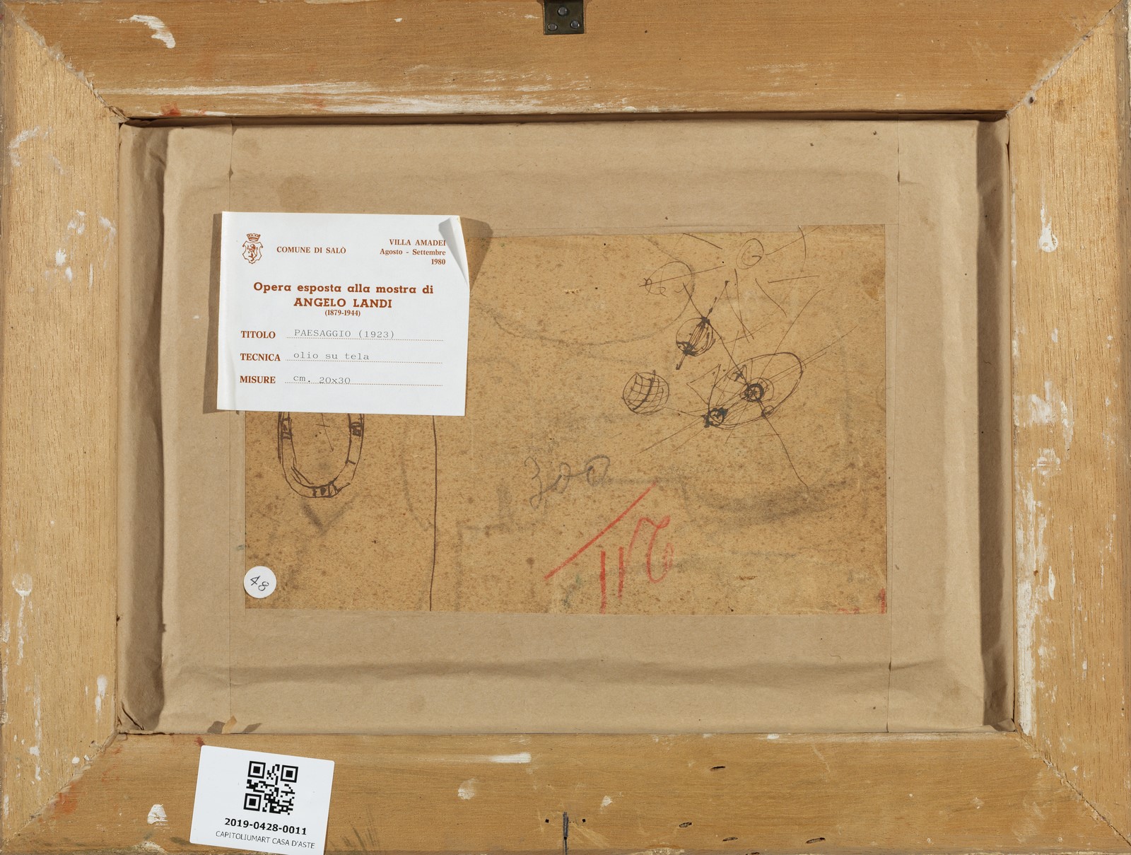LANDI ANGELO (1879 - 1944) Landscape. . 1923. Oil on hardboard. Cm 30,00 x 20,00. Signature and dated lower left. Exhibiton: Villa Amadei, August-September 1980. Publication: Catalogo della mostra Angelo Landi 1879-1944, Comune di Salò, August-September 1980, Magalini Editrice, pp. 138-139.. Cornice presente
