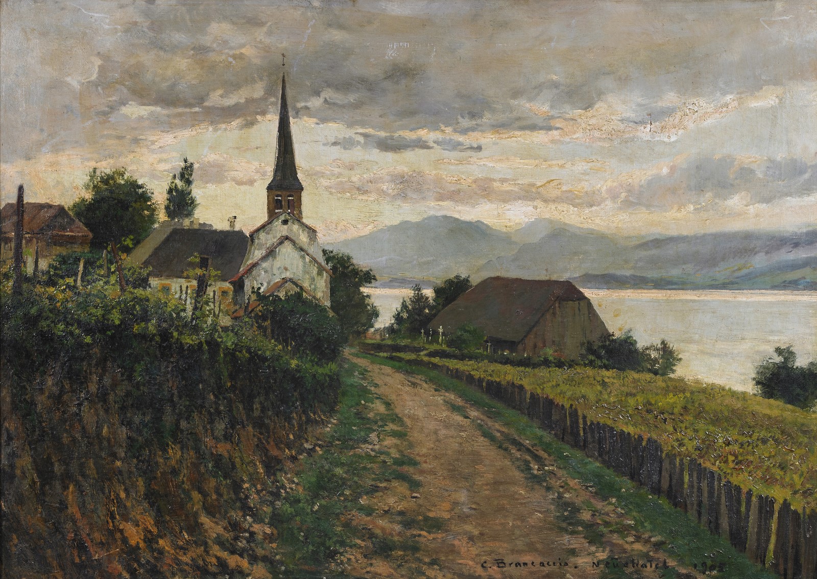BRANCACCIO CARLO (1861 - 1920) Landscape with church. 1905. Oil on canvas . Cm 92,00 x 67,00. Signature and dated lower right. . Cornice presente