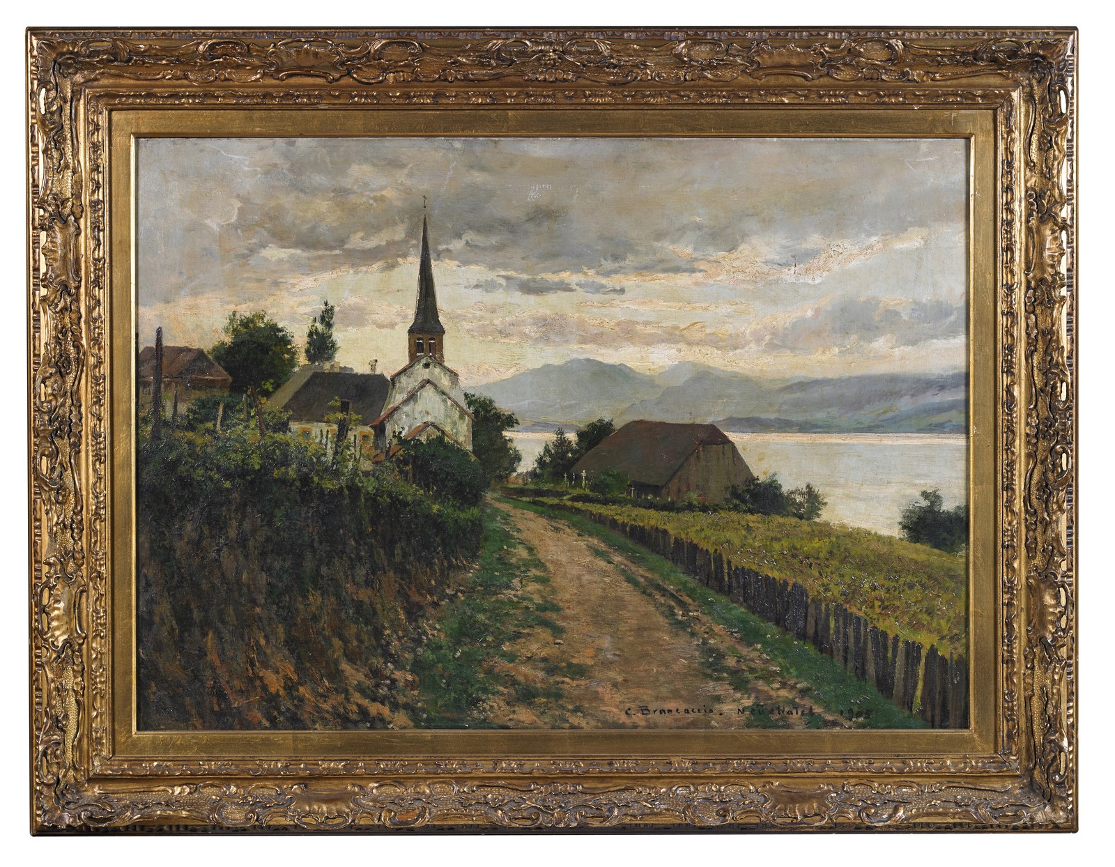 BRANCACCIO CARLO (1861 - 1920) Paesaggio con chiesa. . 1905. Olio su tela . Cm 92,00 x 67,00. Firmato e datato in basso a destra. . Cornice presente