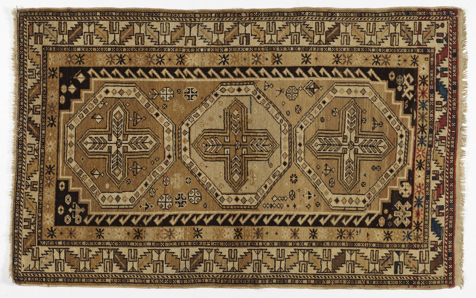 SHIRWAN Shirwan carpet, Caucasus, early '900. . fritware with underglaze and overglaze painted decoration. Cm 110,00 x 182,00. Shirwan medallions. Wool on wool. Abrash upper. Excellent conditions.