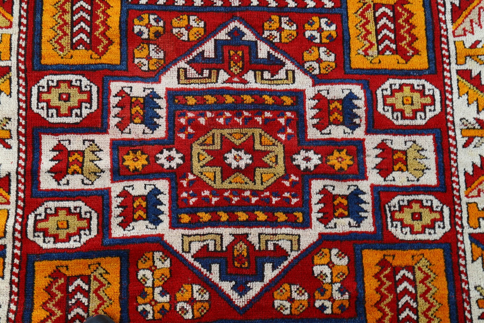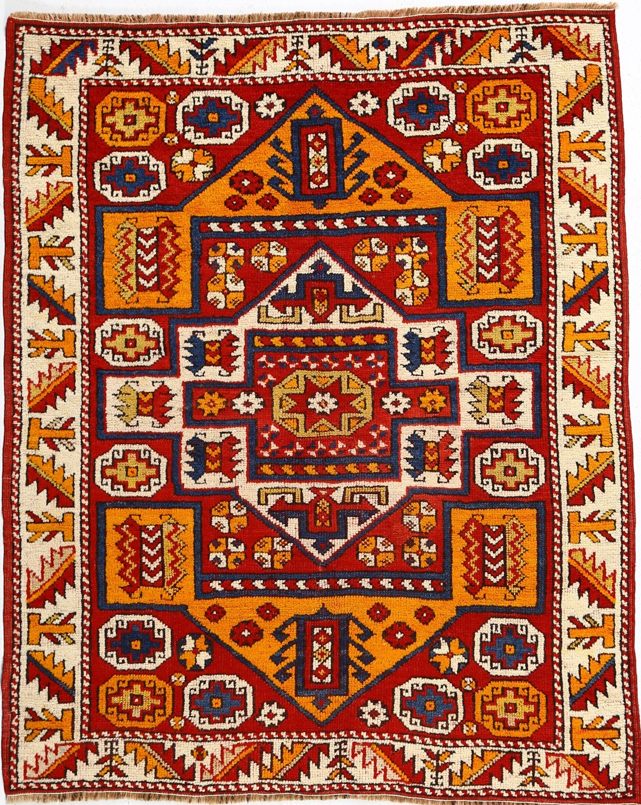 CIANAKKALE Tappeto, area Pergamo. . Cm 131,00 x 165,00. Il quadro presenta un medaglione a più livelli, il cui motivo principale forma un rombo in un poligono scalettato. Le forme interne dovrebbero derivare da un disegno floreale, mentre i profili delle stelle a otto punte e i profili dei tre poligoni sono identificabili come residuo del contorno a fascia di nodi dei tappeti Holbein.Nelle superfici libere del campo ci sono stelle a otto punte. Epoca fine 1800. Bibliografia di riferimento: K. Zipper, C. Fritzche, U. Jourdan, tappeti orientali turco-turcomanni, Ed. Sonzogno.