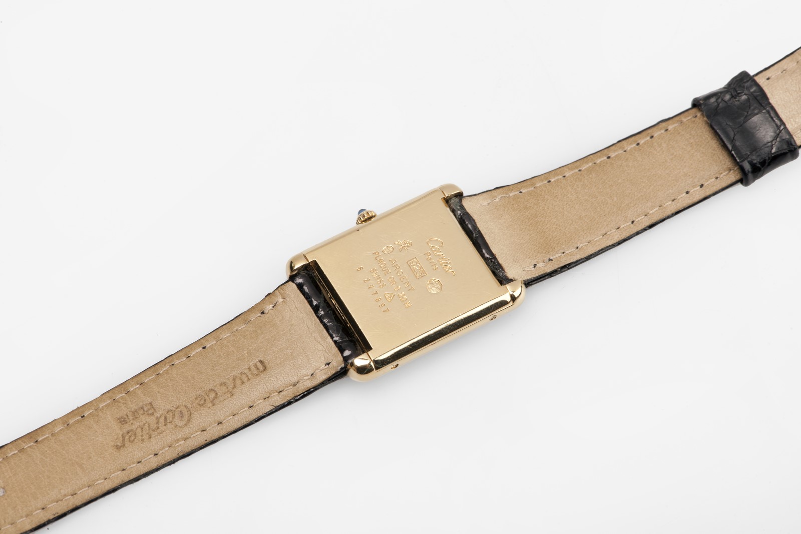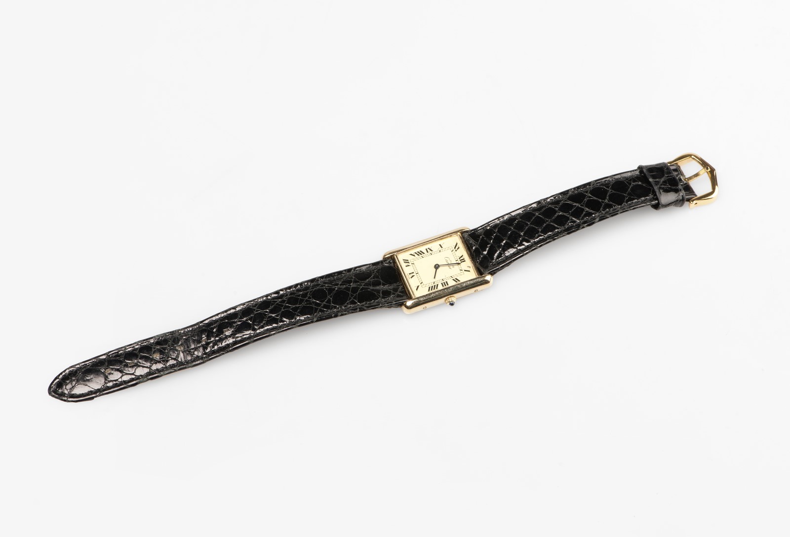 CARTIER Orologio da donna Le Must De Cartier Tank. . . . Cassa rettangolare in argento 925 placcato oro, con fondello chiuso da quattro viti sui fianchi, corona di carica con zaffiro cabochon, vetro zaffiro. Quadrante avorio con numeri romani e indici a bastone radiali, lancette a spada. Movimento al quarzo. Cinturino in pelle con chiusura deployante in vermeil Cartier.
