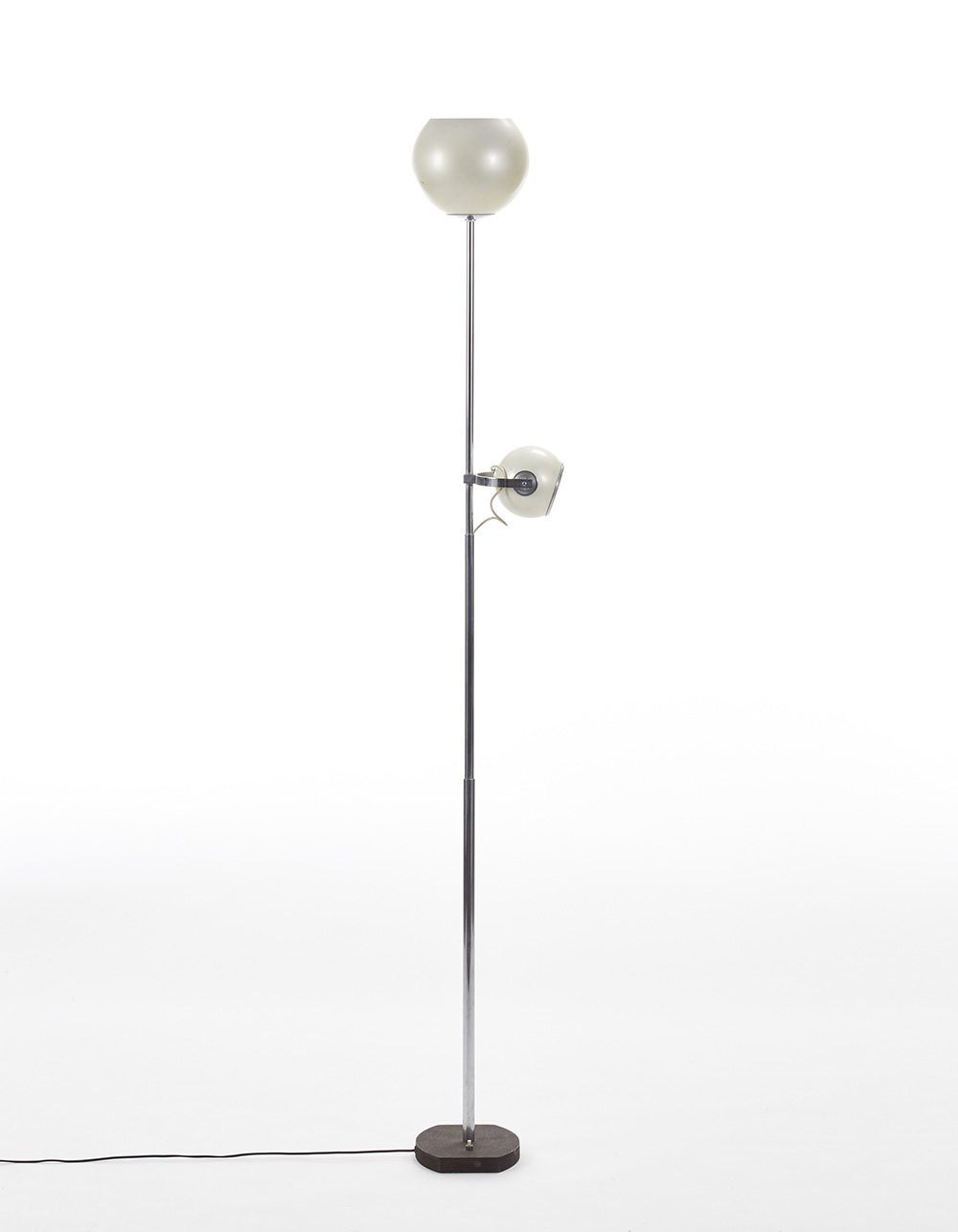 Lampada da terra a luce sommitale e faretto regolabile in altezza. Milano, fine anni '60. Fusto in ottone cromato, paralumi in alluminio cromato e laccato bianco, base in ghisa. (h cm 170) (lievi difetti)