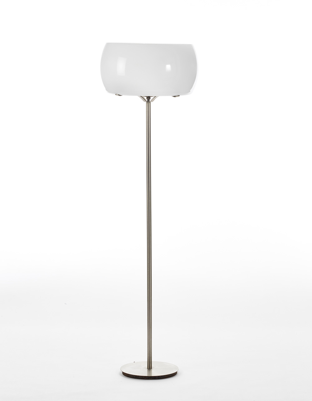 Lampada da terra modello "Clitunno". Produzione Artemide, Milano, 1964. Metallo nichelato e vetro incamiciato lattimo. (h cm 178; d cm 40) (lievi difetti)