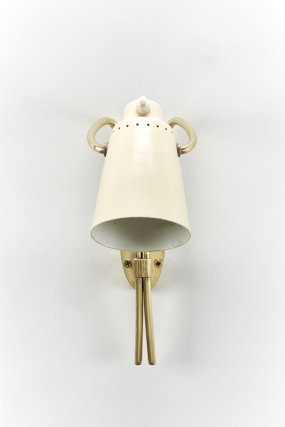 Applique con struttura in ottone, paralume in alluminio stampato e verniciato bianco. Milano, anni '50. Recante etichetta del produttore. (h max cm 33) (lievi difetti)