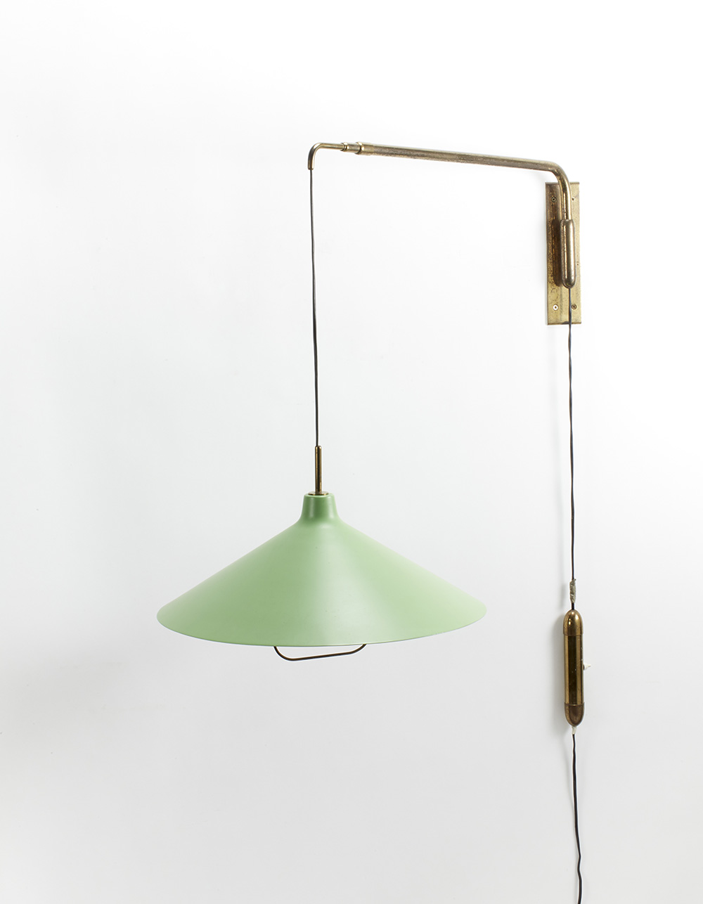 Wall lamp. Produced by Arredoluce, Monza, 1948ca. N. cat. 11. Telescopic structure in polished brass, reflector in green painted aluminum, movable in height through counterweight. (l min 68.5. l max 128; d 47.5 cm) (defects)