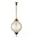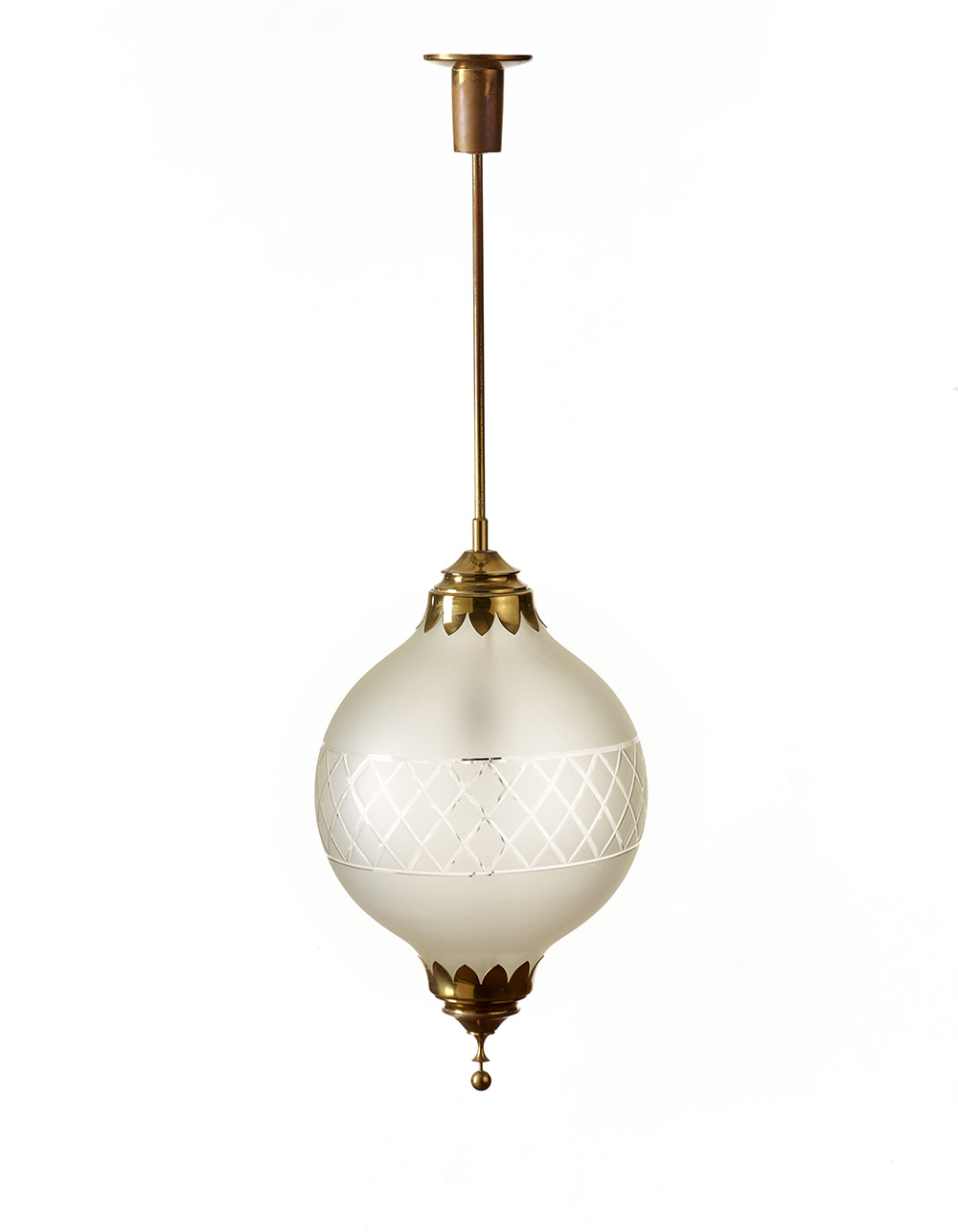 Suspension lamp with brass structure and balloon-shaped diffuser in acidato glass on the outer surface and decorated with rhombus. Monza, 1950s. (h 98 cm.; d 30 cm.) (slight defects)