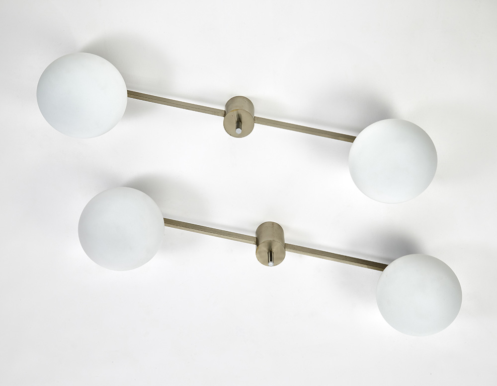 Coppia di lampade a plafone a due luci modello "Stella a 2". Produzione Arredoluce, Monza, 1959ca. Struttura in ottone e acciaio nichelato, portalampade in acciaio laccato nero e diffusori in vetro incamiciato duplex opal satinato sulla superficie esterna. (l cm 127) (lievi difetti)