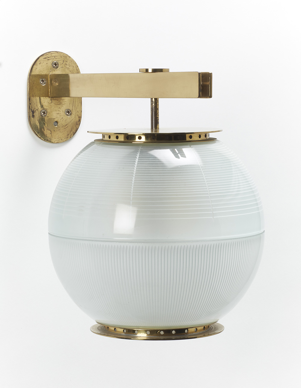 Lampada da parete modello "LP7". Produzione Azucena, Milano, 1955. Diffusore in due vetri uguali abbinati e montatura in ottone lucido. (l cm 45,5, d cm 25) (lievi difetti)