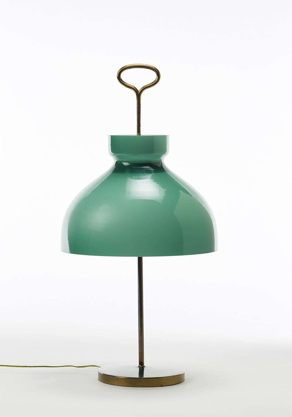 Lampada da tavolo modello "LTA3 Arenzano alta". Produzione Azucena, Milano, 1956. Ottone e vetro incamiciato verde. (h cm 56; d cm 28) (gravi difetti al vetro)
