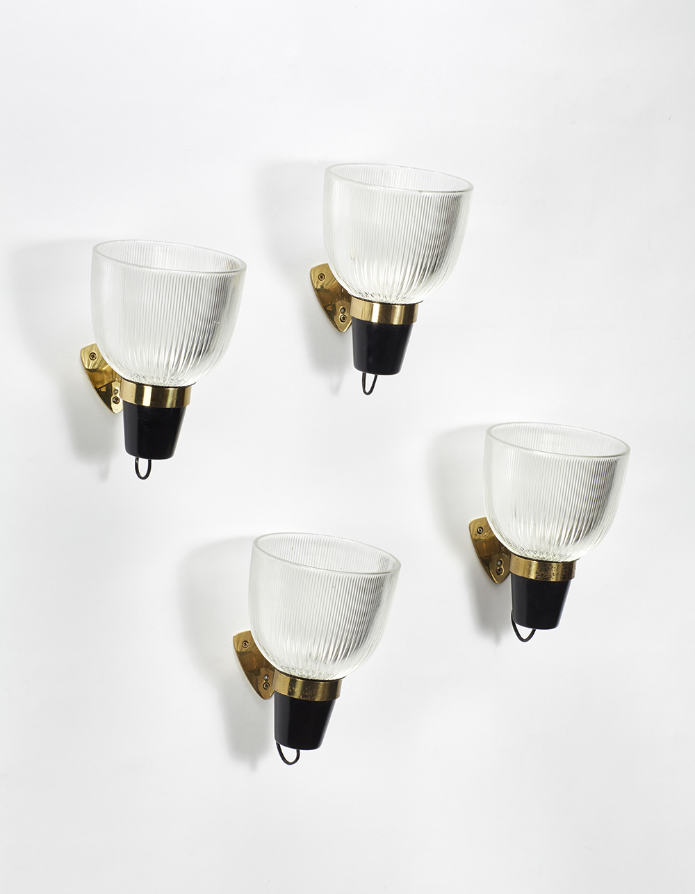 Quattro appliques modello "LP5". Produzione Azucena, Milano, 1954. Diffusore in vetro pressato, struttura in ottone lucidato e brunito. (h cm 21; d cm 16) (lievi difetti)