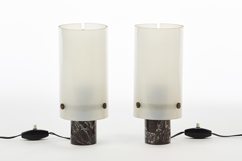 Coppia di lampade da tavolo simili al modello da parete "LP8". Produzione Azucena, Milano, anni '50. Base cilindrica in marmo venato Rosso di Levanto, struttura in ottone verniciato bianco, schermo diffusore cilindrico in perspex opalescente. (h cm 22; d cm 9) (gravi difetti)
