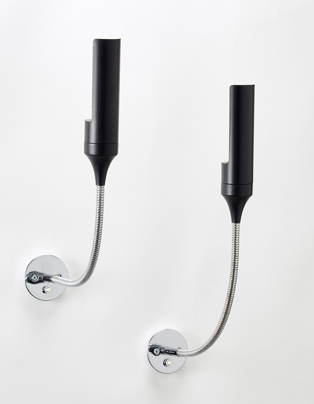 A pair of wall lamps model "595/p". Produced by Arteluce, Milan, 1961. Black lacquered aluminum reflector rotating on flexible stem realized in chromed brass. Bearing manufacturer's label. (h 62.3 cm.)