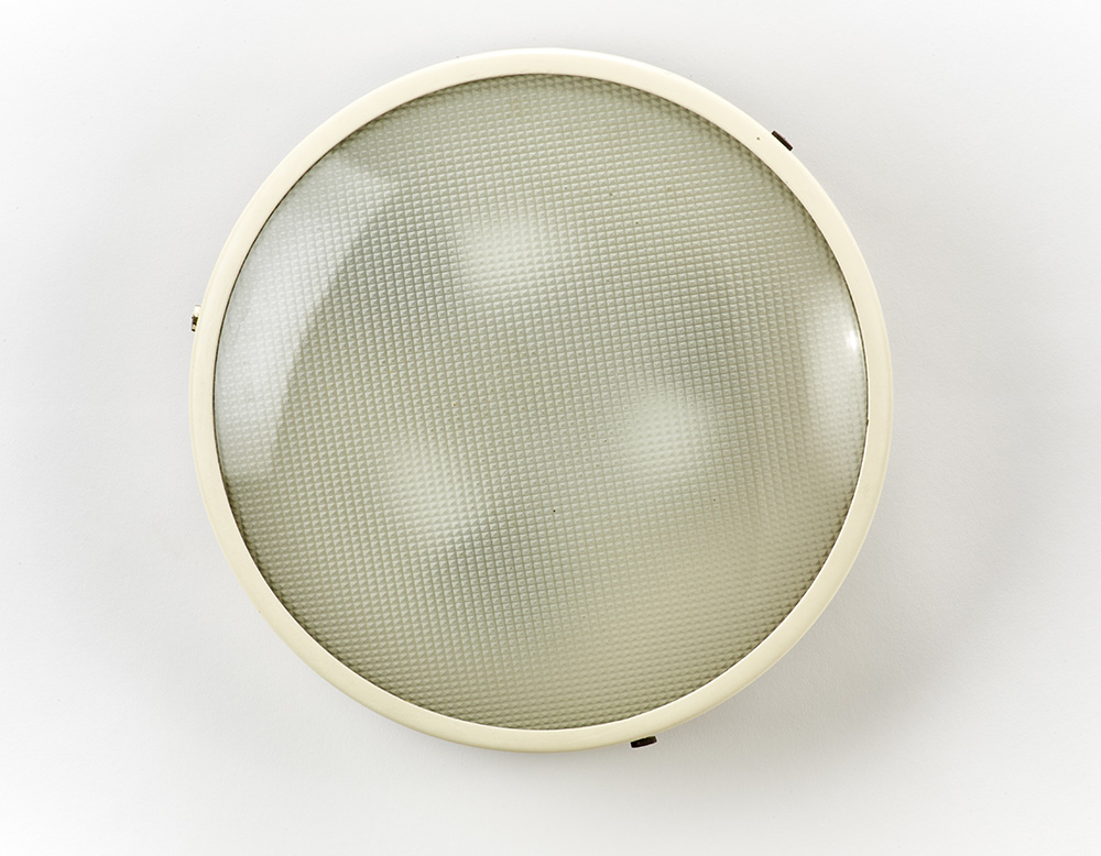 Plafoniera modello "3001/30". Produzione Arteluce, Milano, 1950ca. Alluminio stampato laccato bianco, vetro diffusore prismatico a quadrotti. (d cm 30) (difetti)