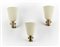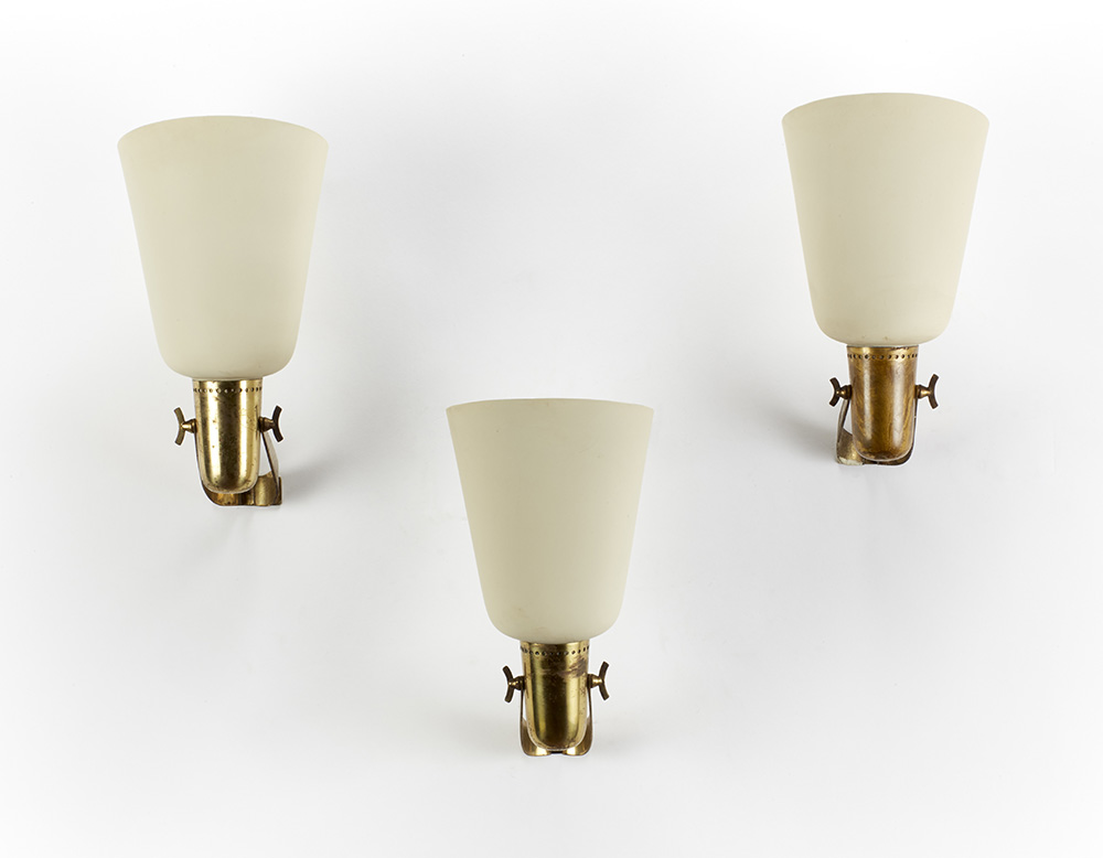 Lotto composto da una coppia di lampade da parete unita ad una singola modello "121". Produzione Arteluce, Milano, 1946. Riflettore, orientabile sull'asse verticale, in alluminio laccato bianco; canotto portalampada e staffa attrezzata con galletti a farfalla in ottone lucido. (per la coppia: l cm 33, d cm 18,2; per la singola: l cm 31,8, d cm 17,8) (lievi difetti)