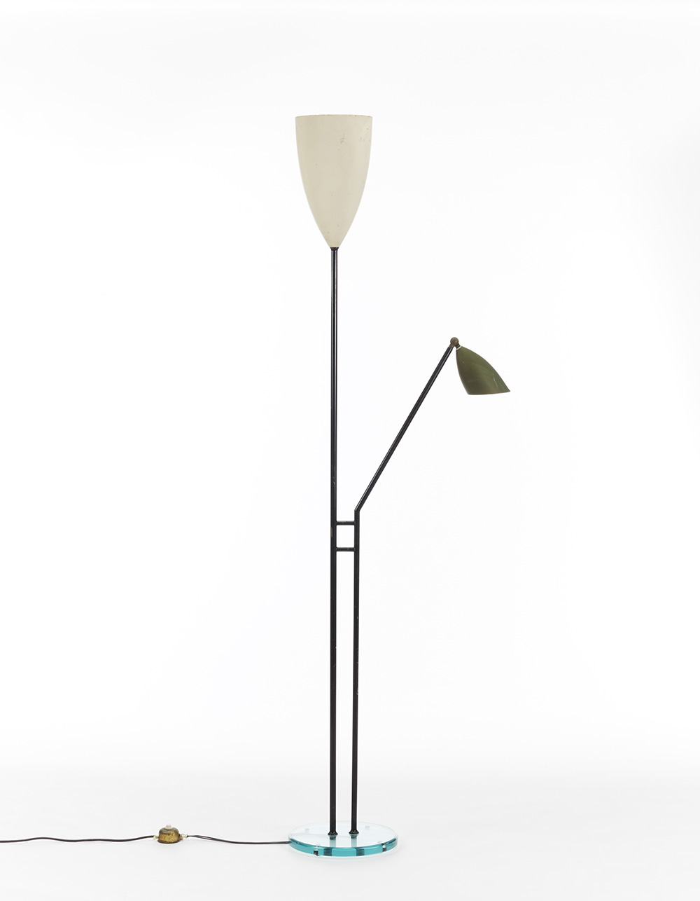 Lampada da terra a due luci con struttura in tubolare metallico laccato nero, un diffusore fisso a calotta stampata e imbutita in alluminio laccato bianco e un diffusore orientabile con snodo in ottone e calotta in alluminio laccato verde, base in cristallo molato di forte spessore. Italia, anni '50. (h cm 197) (lievi difetti)