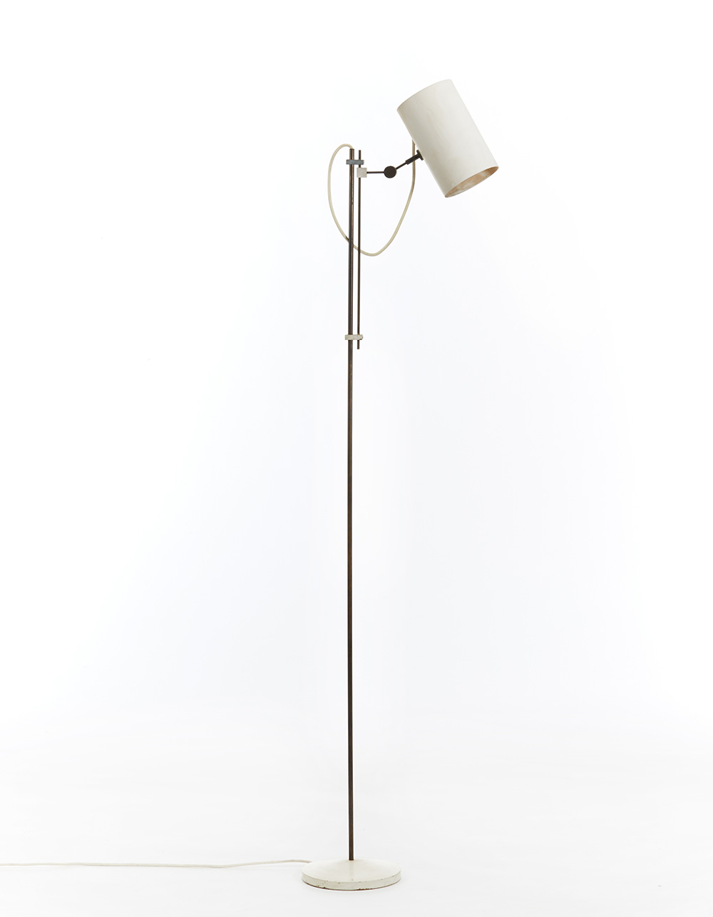 Floor lamp model "365". Produced by O-Luce, Milan, 1950s. Structure in brass rod, adjustable joint and cylindrical lampshade in white lacquered aluminum, base in white lacquered metal casting. (h 160 cm.) (slight defects)