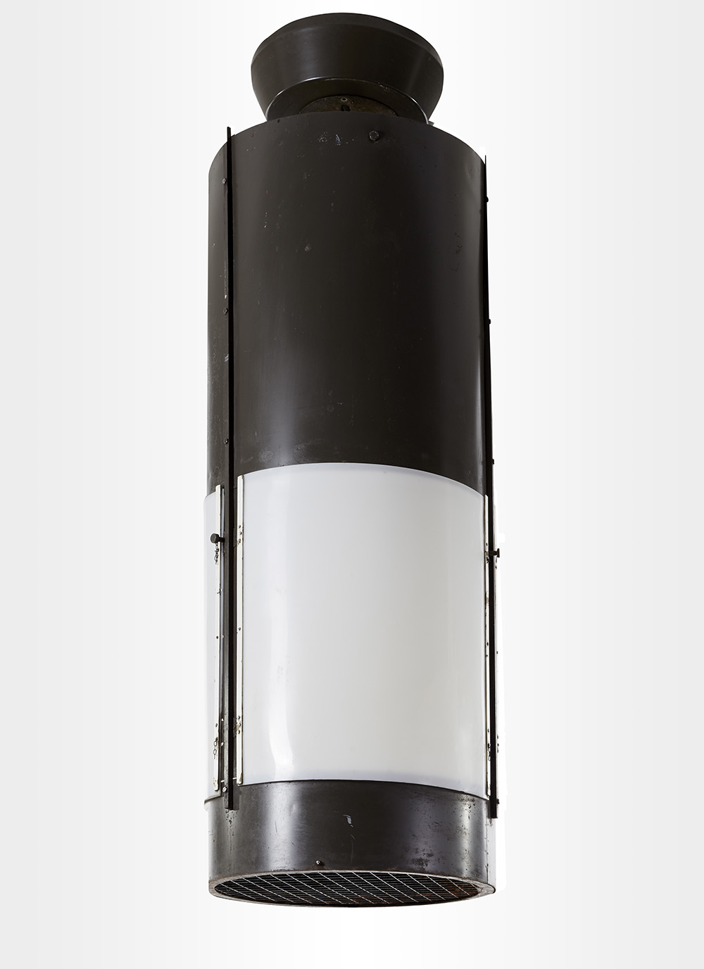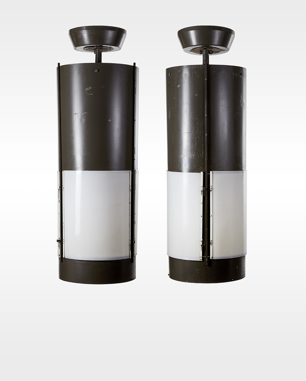 Coppia di lampade a sospensione disegnate espressamente per l’edificio per uffici e abitazioni della società Mediolanum in Corso Vittorio Emanuele II. Milano, 1971. Metallo ferroso verniciato color marrone e bianco opaco, perspex opalino lattimo, ottone. (h cm 180; d cm 60) (lievi difetti, piccoli restauri e sostituzioni)