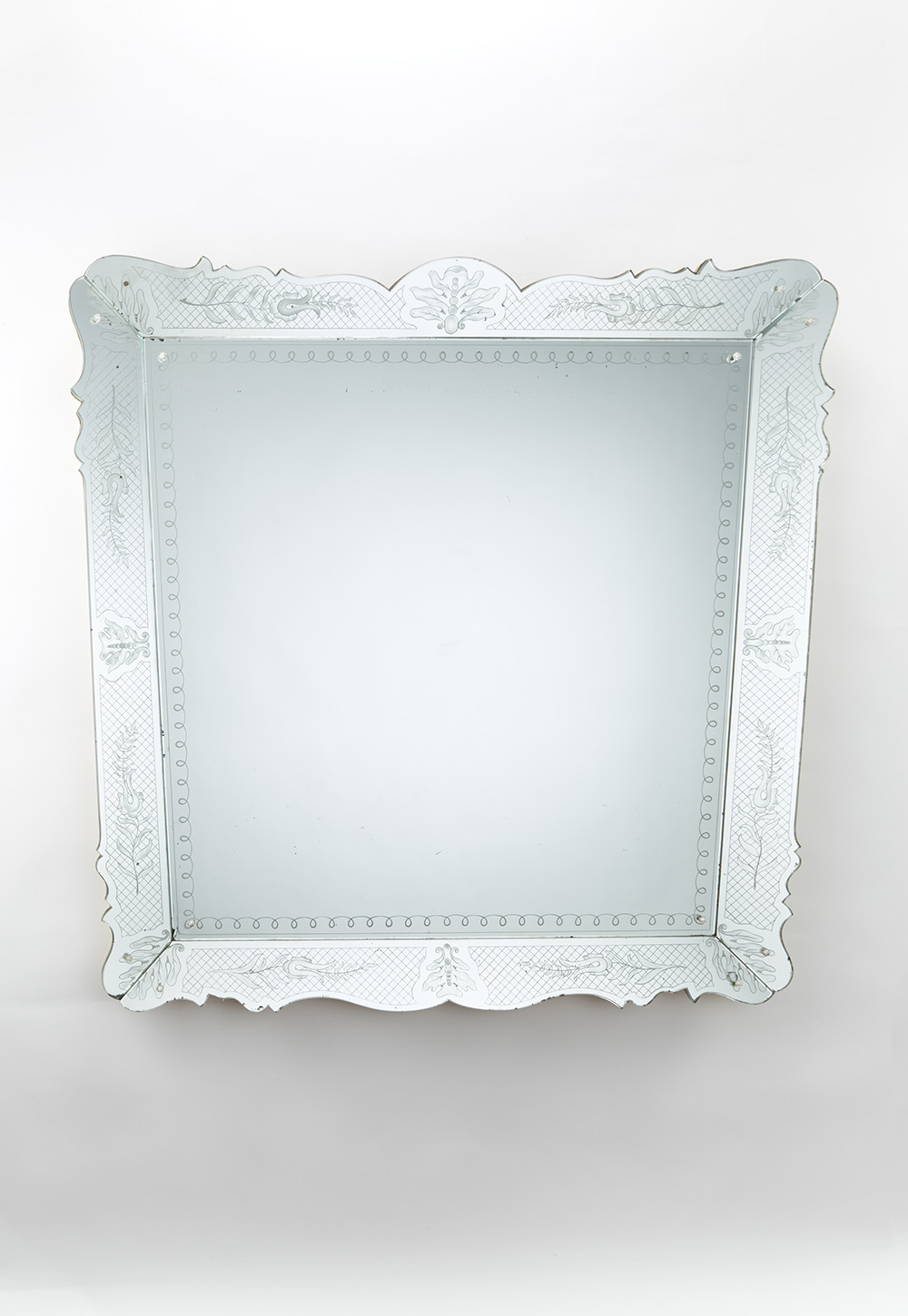 Mirror in bevelled crystal and decorated with acanthus leaves and geometric motifs through sand engraving. Milan, 1920s/1930s. (119x7x119 cm.) (defects and small losses)
