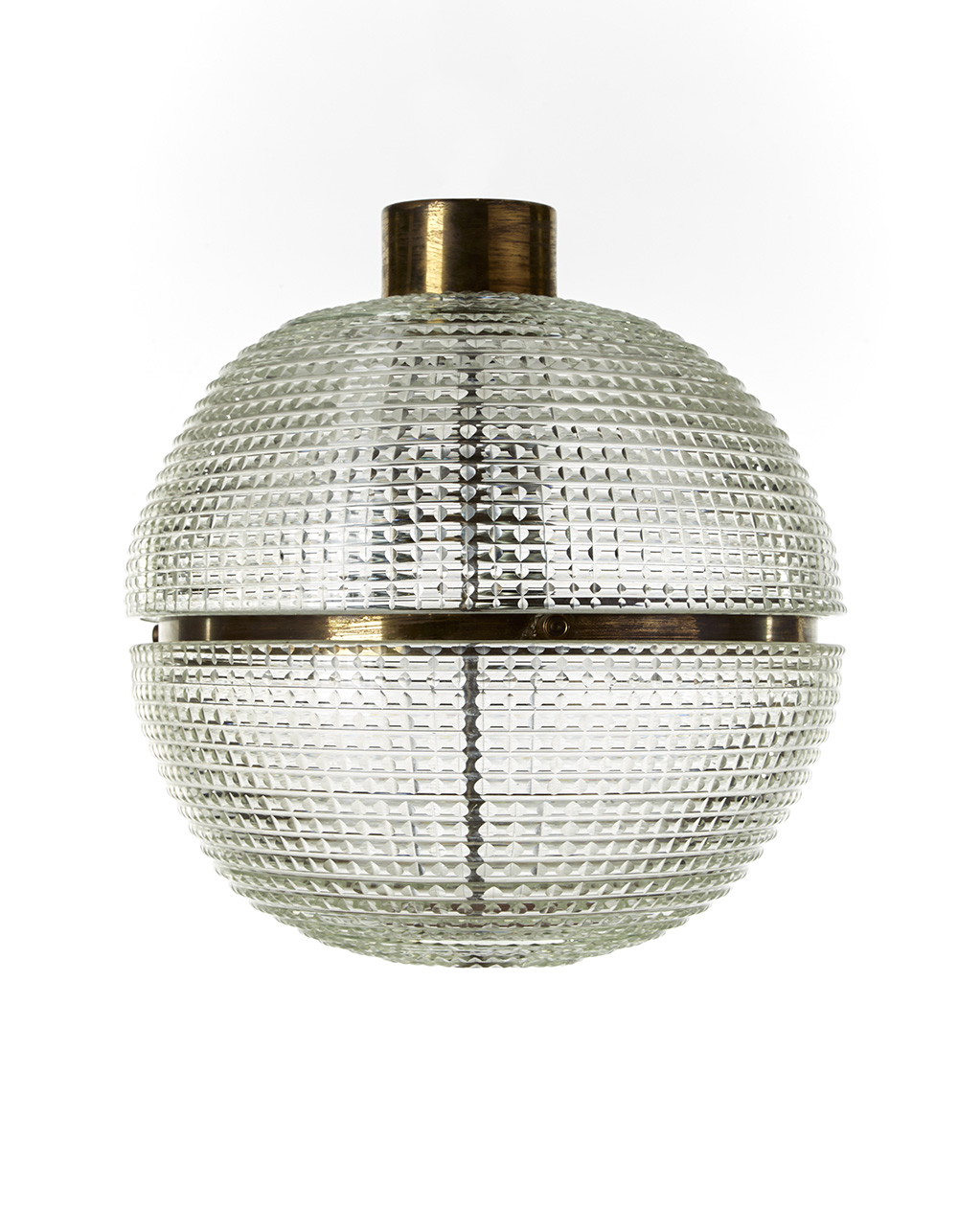 Lampada a sospensione sferica, disegno n. 5432 del Catalogo Blu. Venini, Murano, 1936. Doppia calotta in vetro cristallo cordonato inciso. Struttura in ottone. Firma "Venini" incussa nell'ottone. (h cm 55; d cm 40) (lievi difetti)