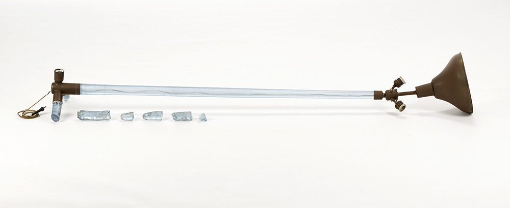 Lampada da terra disegno n. 527 del Catalogo Blu. Venini, Murano, anni '30. Vetro massello azzurrino trasparente corroso sulla superficie esterna. Montatura in ottone. (h cm 172) (gravi difetti e mancanze)