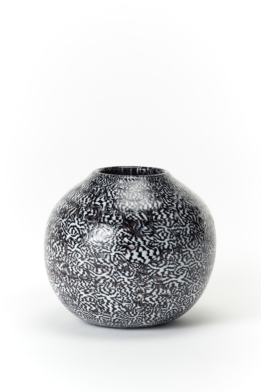 Vaso globulare della serie "Dama". Murano, 1988. Vetro soffiato a murrine lattimo e ametista scuro opaco. Firmato a punta sotto la base "Venini 88". (h cm 18)