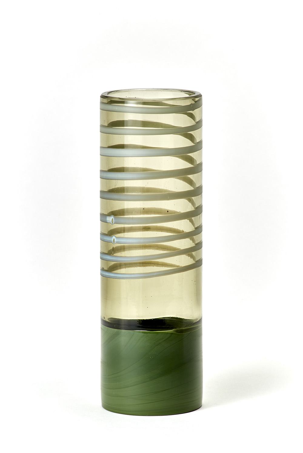Cylindrical vase model "8631". 1962ca. Base in antique green joined to incalmo to a band in transparent glass, included lattimo spiral. "Venini Murano ITALIA" signed with acid. (h 30 cm.) (defects and restorations)