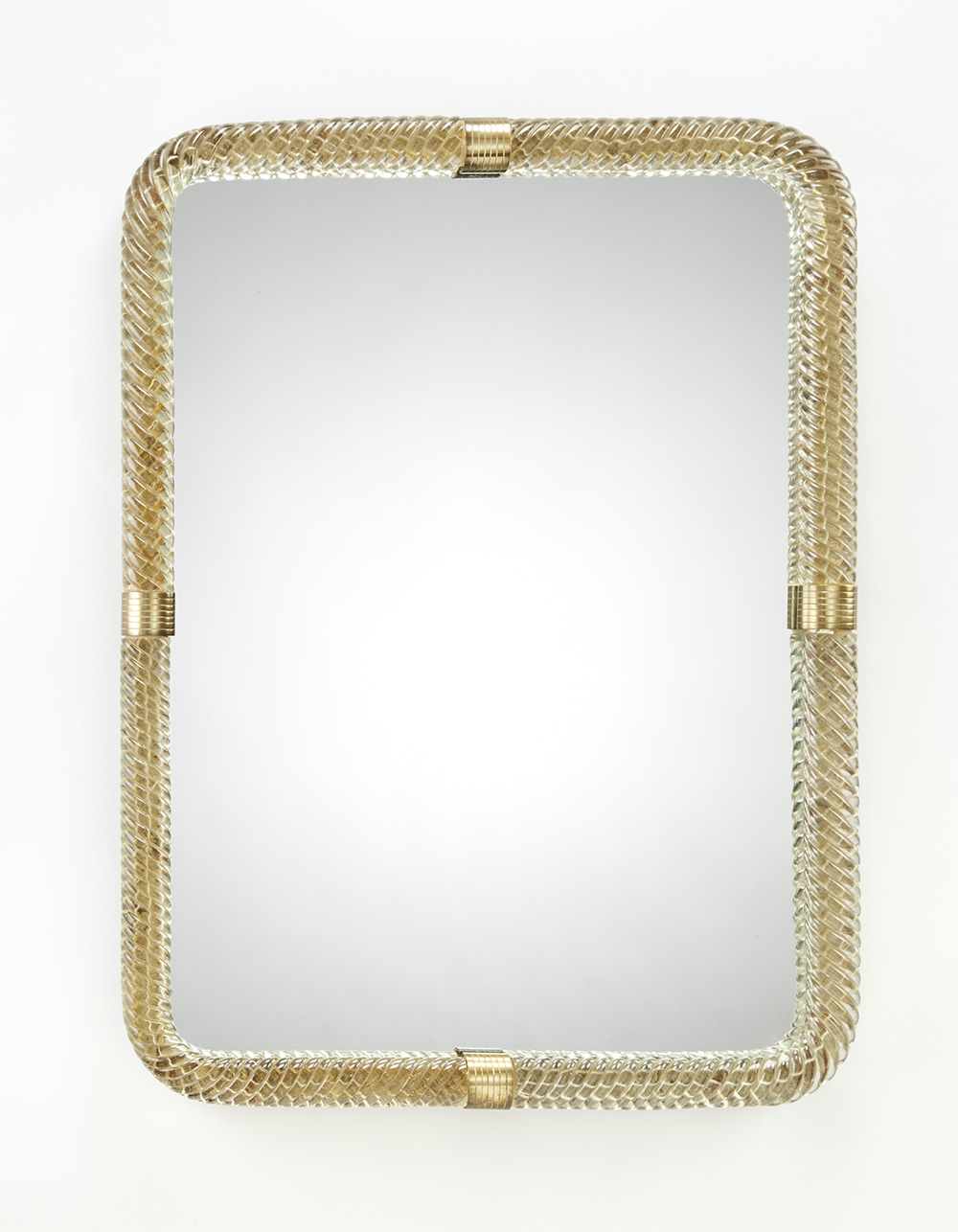 Specchio con cornice in vetro sommerso cristallo e ambra lavorato a treccia. Montatura in legno e ottone. Anni '30. (cm 68x92x7)
