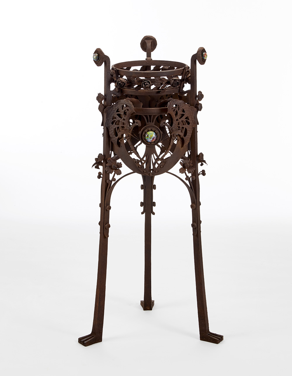 Wrought-iron tripod planter decorated with floral elements and butterflies and polychrome cabochon Murano glass inserts. Milan, early 20th century. (h 127 cm.) (slight defects)