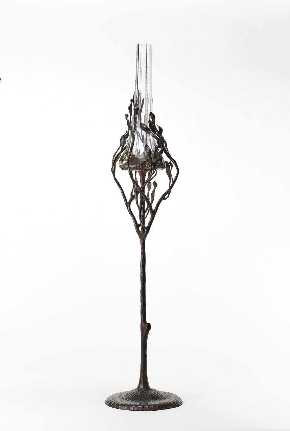 Scultura per lampada/torcera da terra in ferro battuto a foggia arbusto, base circolare in lamina sbalzata, terminazione a groviglio di foglie lanceolate reggenti un vaso in vetro di Murano cristallo soffiato e lavorato alla mola. Roma, anni '20. (h vaso cm 38,5; h tot cm 112) (lievi difetti)