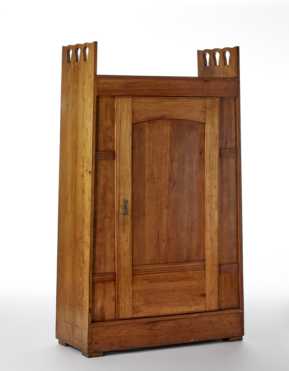 Mobile da ingresso Wiener Secession in legno chiaro massello con fronte ad un'anta riquadrata e decorata con motivi lineari orizzontali. Montanti laterali inclinati con coronamento ondulato e intagliato. Esecuzione Anton Pospischil, Vienna, 1900ca. (cm 100,5x184,5x49) (lievi difetti)